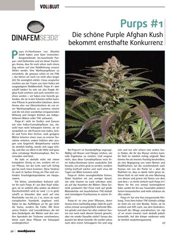 urps #1-Hanfsamen von Dinafem Seeds haben zwei klare Unterscheidungsmerkmale: be-rauschende Purpur- und Herbsttöne und ein derart fruchtiges Aroma, dass ihr euch schon nach einem Zug mitten auf eine Waldlichtung versetzt fühlen werdet. Eine Marihuanapflanze zu entwickeln, die genauso schön ist wie PAK – das hätten wir noch vor nicht allzu langer Zeit für unmöglich erklärt. Umso utopischer erschien uns der Traum von einer Indica mit ausgeprägtem Waldbeerduft. Purps #1 aber schafft beides! So sehr wir also Purple Afghan Kush verehren und auch weiterhin verehren werden – wir haben eine Genetik gefunden, die sie in den Schatten stellen kann: eine Pflanze in prachtvollen Lilatönen, deren Aroma eher von Obststräuchern als von einer Marihuanapflanze zu stammen scheint und die mit einer wunderbar entspannenden Wirkung und riesigen Kelchen aus indigofarbenen Blüten voller THC aufwartet. Purps #1 sieht im Großen und Ganzen wie eine Indica-Cannabispflanze aus, obwohl man nicht behaupten könnte, sie sei tatsächlich zu 100 Prozent eine Indica. Größe und Form ihrer breiten, stark gesägten Blätter könnten einen zwar zu ersterer Annahme verleiten, andere Indizien aber zeugen vom Gegenteil. Beispielsweise wächst sie ziemlich kräftig, streckt sich sogar richtig, und dies vor allem in die Höhe und ganz ohne extralange Wachstumsphase. Ihre Internodien sind breit. Ihr habt es deshalb nicht mit einem kompakten Zwerg zu tun, sondern mit einer Pflanze, bei der Licht und Luft richtig gut bis nach innen kommen. Diese Struktur ist auch in Sachen Ertrag ein Plus und verhindert Feuchtigkeitsprobleme am Hauptstamm. Für kleine, unscheinbare Kulturen solltet ihr euch Purps #1 aus dem Kopf schlagen; sie ist wirklich alles andere als diskret! Durchschnittlich wird sie rund 1,3 m groß, schafft es bisweilen aber auch auf eine Wuchshöhe von bis zu 3 m, wenn sie nach europäischen Standards angebaut wird. Dabei ist das Auffälligste an ihr gar nicht die Statur, sondern die Farbe: Mit ihren satten Violett- und Lavendeltönen, die mit dem Dunkelgrün der Blätter und den weißen Sprenkeln der Trichome verschmelzen, bietet euch diese Pflanze ein Schauspiel sondergleichen!