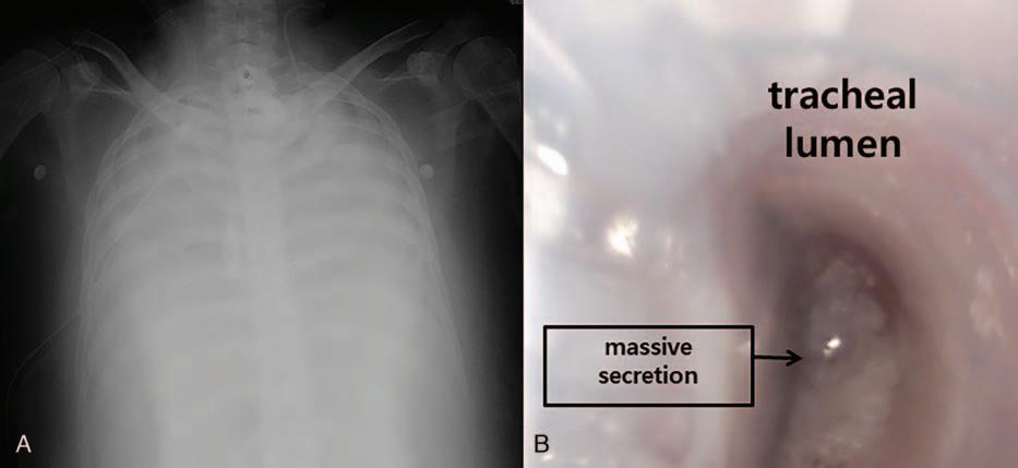 Figure1. Perioperativeimagesofthepatient.A,Preoperativechestx-ray,showingseverediffuselungconsodiation.B,Bronchoscopic finding,showingmassive pulmonarysecretionwithintheconventionaldouble-lumenendobronchialtube.