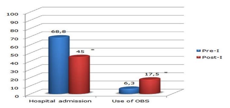 the patients in whom the PSI was calculated, this decrease being greater after the intervention (68.8% pre-I vs. 45.0% post-I, p < 0.05) (Figure 1). Regarding the use of the OBS, a greater use of the OBS after the intervention was aimed at those patients in whom the PSI was calculated (06.3% pre-I vs. 17.5% post-I, p < 0.05) (Figure 1). The total breakdown of the patients at the different PSI levels as well as their destination (home/admission and OBS) may be observed in Table 2