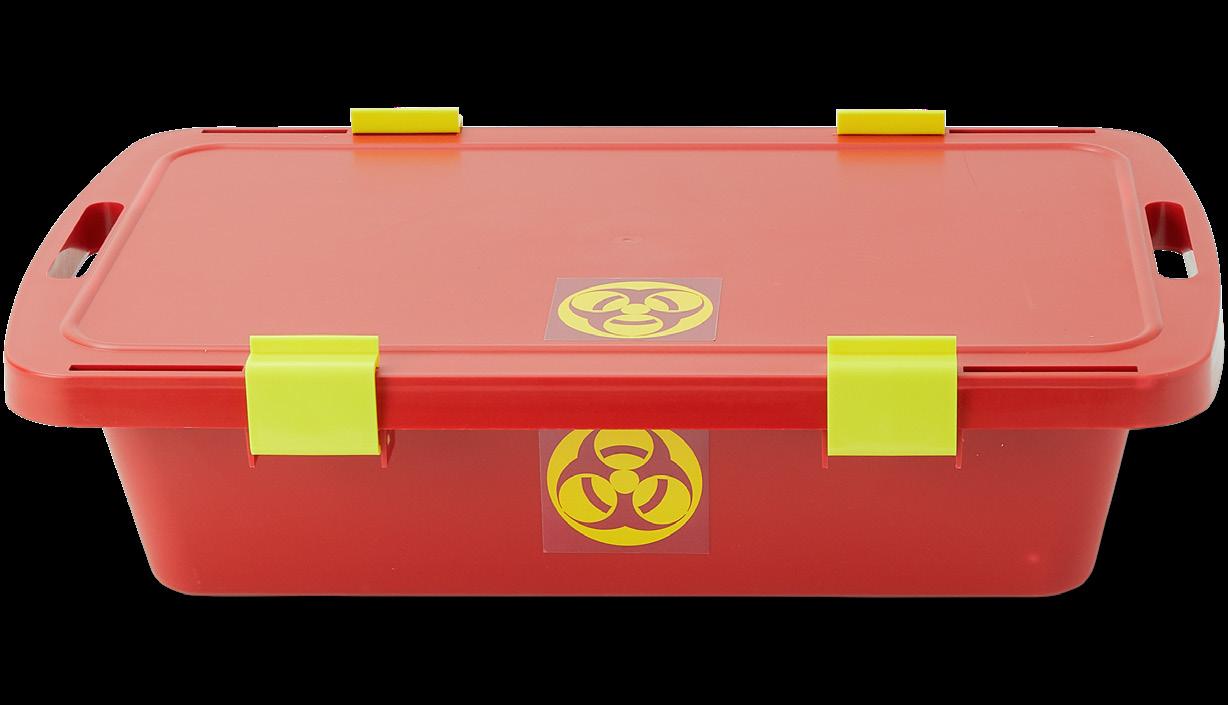 Our new biohazard container is designed to safely keep and transport contaminated instruments and devices from the point of use to reprocessing and help you meet OSHA blood borne pathogen standards*. Our highly durable and easy-to-clean containers offer many standard features, including: