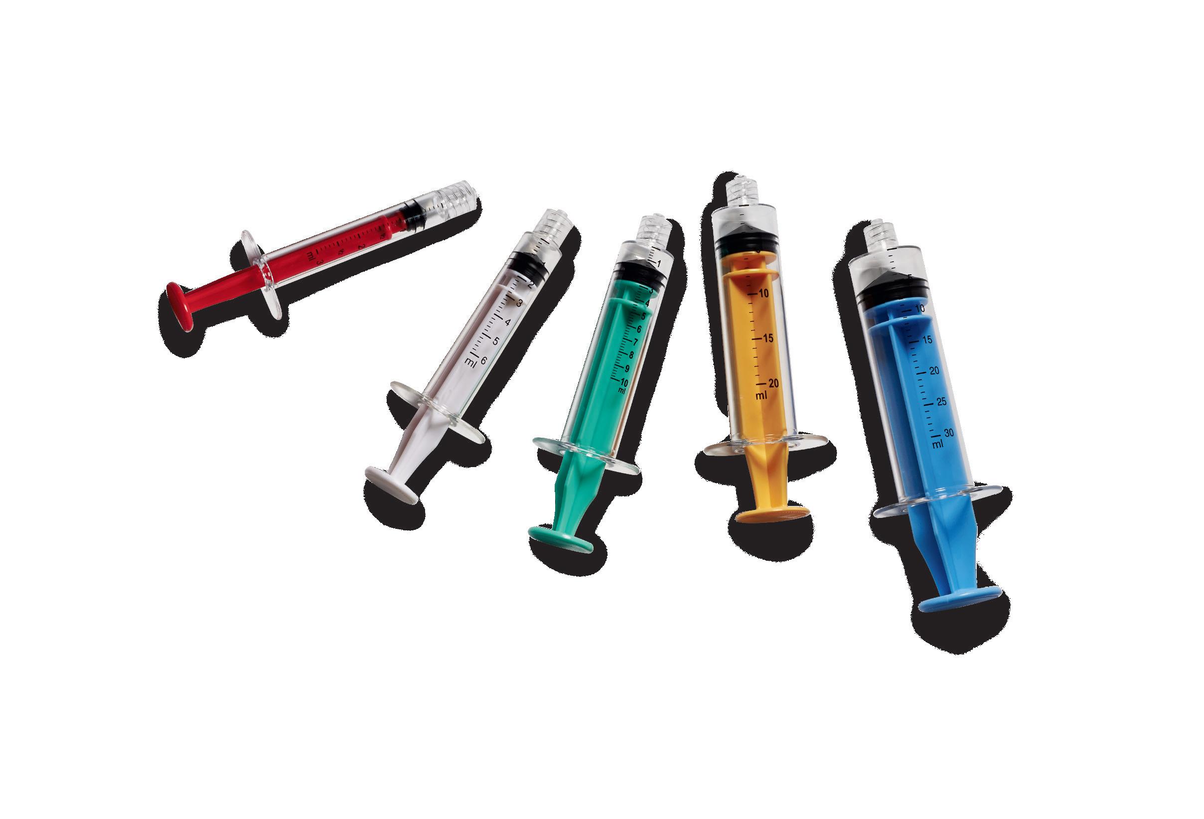 Colored syringes–Polycarbonate Clear polycarbonate design allows for visual inspection of air bubbles. Available in different colors and sizes.