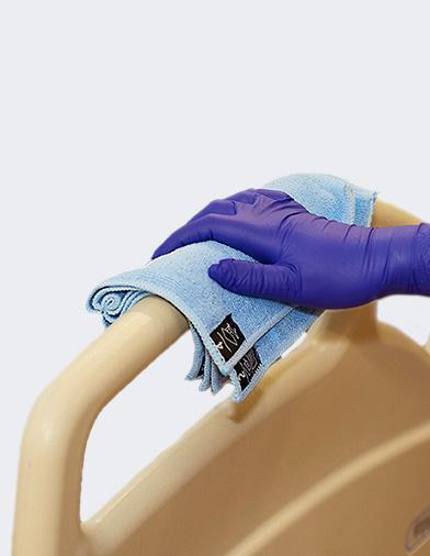• Then apply disposable disinfectant wipes. Use a new wipe for each surface to avoid cross contamination. If a surface starts to dry before the contact time (printed on the disinfectant), apply more product until the correct amount of time has passed.