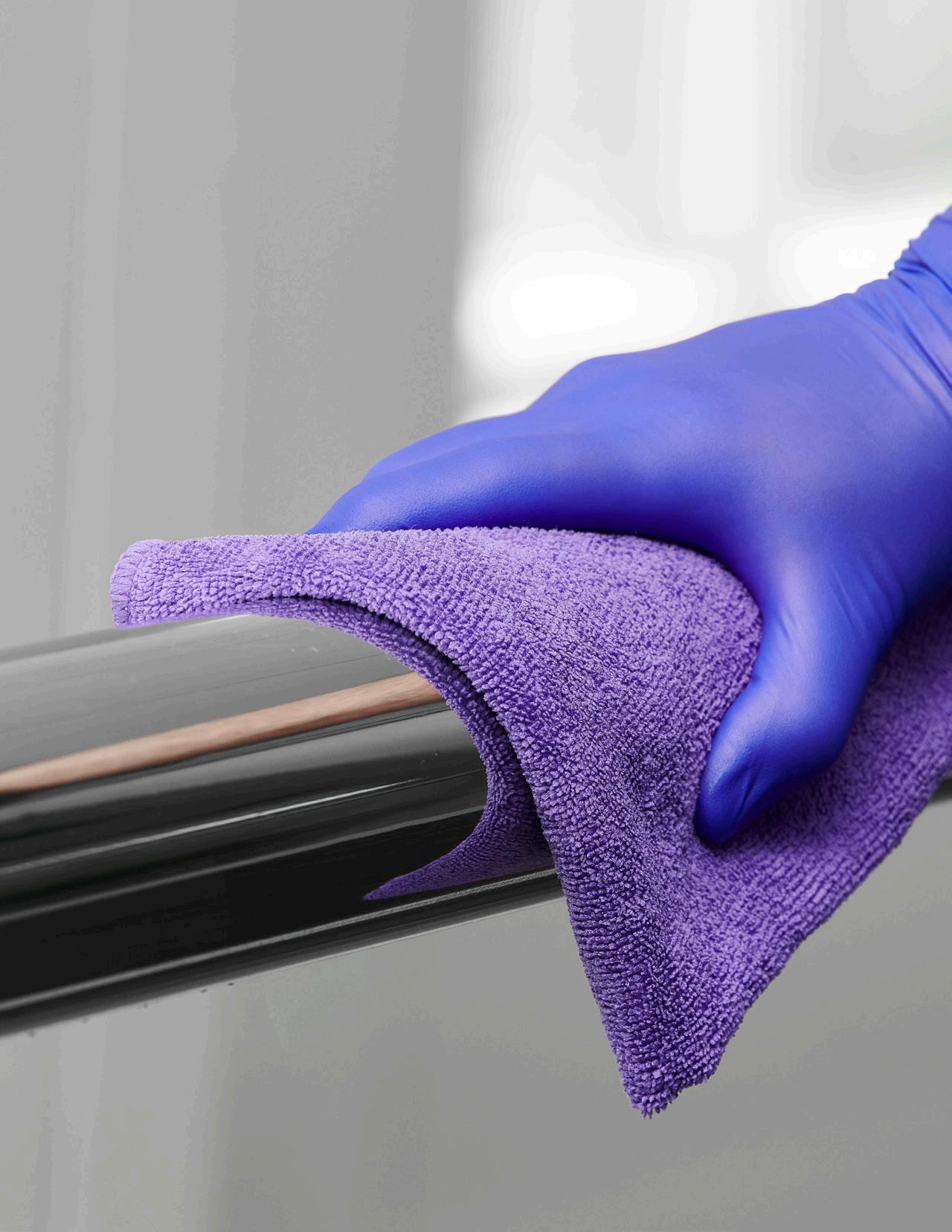 • First remove soils and residue with a microfiber cloth or one-step germicide.