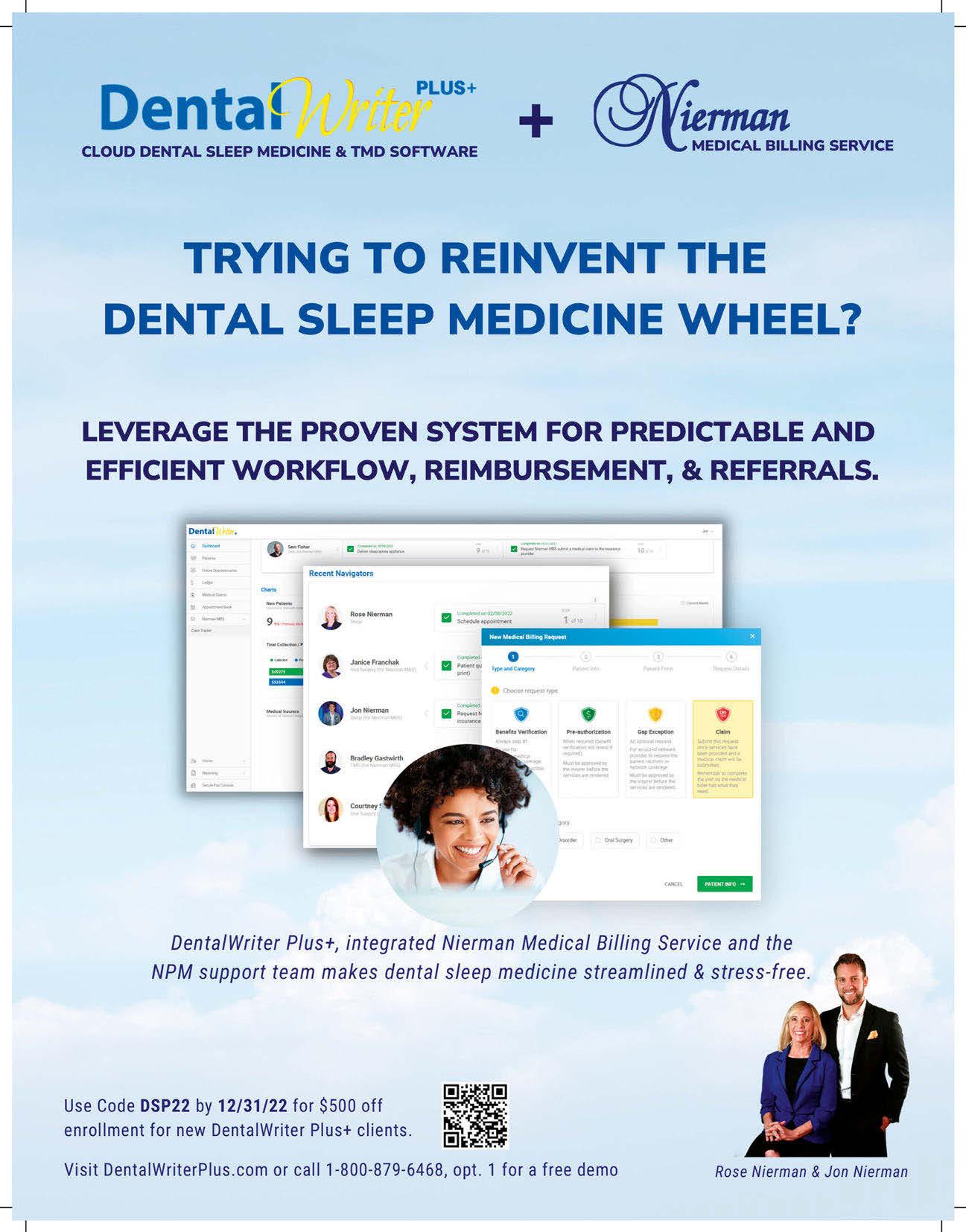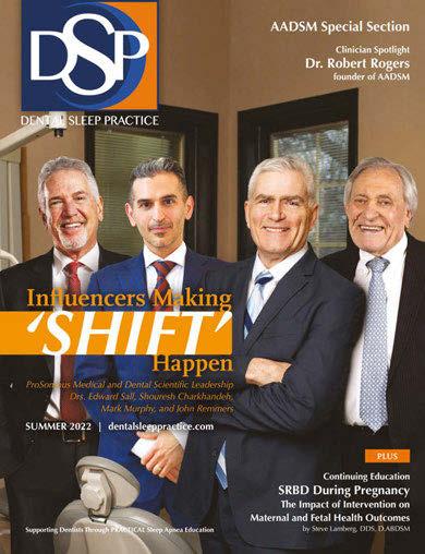 ©MedMark, LLC 2022. All rights reserved. The publisher’s written consent must be obtained before any part of this publication may be reproduced in any form whatsoever, including photocopies and information retrieval systems. While every care has been taken in the preparation of this magazine, the publisher cannot be held responsible for the accuracy of the information printed herein, or in any consequence arising from it. The views expressed herein are those of the author(s) and not necessarily the opinion of either Dental Sleep Practice magazine or the publisher.