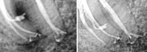 Figure 7 (left): Periapical radiograph with a fractured composite filling on the right maxillary central incisor and a large periapical lesion apically. Figure 8 (right): Periapical radiograph of the right maxillary incisor following instrumentation and obturation, noting some apical resorption of the root