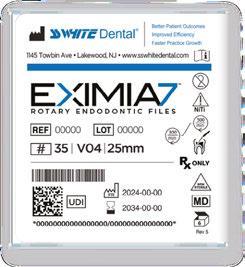 EXIMIA7™ endodontic files are designed with precision, flexibility, and durability to improve and simplify instrumentation of the canal system. These NiTi files are heat treated to increase resistance to cyclic fatigue and enhance the files’ strength and flexibility, minimizing shape memory for optimal precision. This also allows for extreme flexibility of the file in curved canals, reducing file shape memory, preserving canal anatomy, and limiting or eliminating over-instrumentation of the inner curve that may happen with stiffer files. Additionally, the files allow for instrumentation in challenging canal anatomy. The “controlled memory” of EXIMIA7™ files allows the file to return to its original shape after being bent during instrumentation in curved canals, thus maintaining the desired path in the canal. The files have a parabolic cross section, maximizing the files’ cutting efficiency for smoother procedures. They have a 1mm maximum flute diameter that allows for minimally invasive preparation, preserving tooth structure in the critical cervical area of the root. A non-cutting tip on the files provides precise guidance and centering the files within the canal, aiding in elim-
