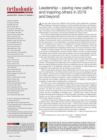 new year often brings upon reflection of the previous year’s experiences, successes, and challenges while also stimulating our minds to generate fresh ideas. As professionals, business owners, and highly motivated individuals, we naturally seek to better ourselves and those around us by leveraging past experiences and knowledge. The challenge in taking on new ideas is in fully understanding the nature and consequence of the change, sound implementation of the process, and securing acceptance by others involved. Simon Sinek describes leaders possessing two important qualities in his book, Start with Why: How Great Leaders Inspire Everyone to Take Action. He writes that leaders “must have a vision of a world that does not exist, and they must have the ability to communicate it.” In a budding or thriving practice, there is a continuous flow of needs and opportunities, and those are best captured by us, the orthodontists, who possess both the 30,000-foot and day-today view of operations and function. The development of change intended to improve our results — practice, patient, community, or otherwise – requires comprehension of how the said change can effectively be integrated as well as how it can truly be maximized in impact. Mentally immersing ourselves into that process begins to provide a simulated picture of the journey of implementation. We also would be remiss to not ask our peers (includes orthodontists, team members, family, friends, patients, and community) calculated, thoughtout questions and scenarios about their views on the idea and implementation. Data and correct data interpretation lead to less assumptions and more accurate next steps. The common language that binds us all is empathy. What normal languages of the world cannot bridge can be resolved with a soft smile, a welcoming gesture, or a kind act, for example. This language drives relationships with our patients and community as well as our teams and willing participants joining our lives and professional journeys. What does empathy and language have to do leadership, particularly in our discussion of implementation and acceptance? It has everything to do with pushing an idea forward. Dale Carnegie spoke extensively about relationships and how they drive the business world. Our discussions in the office are better served when they are true dialogues with our team, patients, and community. Involving our peers in our solutions provides several benefits, most notably expanding our own myopia through incorporation of other’s experiences as well as having the change be created by a group of people rather than by one individual. This approach has the ability to galvanize more enthusiasm in addition to readily gaining acceptance. Inspire others by allowing them to inspire you! We will be sure to face unanticipated hurdles along our journey, and when the vision is unique and untested, even small failures can result in loss of trust among the team. Resilience and re-centering becomes a key focus in reestablishing that faith and belief in questionable moments. You alone, the visionary, know that by unequivocally rising again and pushing forward, success will emerge at some point with the greater good as the beneficiary. That success may be in quantifiable or intangible ways — perhaps more money or even just through incremental growth experiences. Through calculated, coordinated, and diligent efforts, however, you can assure yourself that your ideas, implementation, and larger acceptance will be heard, realized, and earned. In our family, we always say “believing is seeing.” Believe in your ideas and the orthodontic profession’s future. With a heart full of love, hands of compassionate care, and an unparalleled vision, forge ahead relentlessly with grit and hustle — and of course, empathy. Bring to life your dreams and the dreams of others while also realizing that rarely do we journey alone, so embrace the amazing and wonderful people around you. When you reach your ultimate goal, you will then have many people around you with which to celebrate. One love to all and to all a peaceful and incredible 2019 — make it the best year you’ve ever had! “Be the change that you wish to see in the world.” — Mahatma Gandhi Dr. Shalin Raj Shah