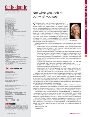 he question is not what you look at, but what you see.” This philosophy from the journal of author Henry David Thoreau, written in 1851, still rings true in 2016. Perception has the potential to skew people’s views in every facet of daily life. This is evident in the 2012 “Behind the Smile” perception study, conducted by market research consultancy Kelton Global (known as Kelton Research at the time of the study) for Invisalign®. For the study, non-dentist respondents were shown images of people and asked to give their honest opinion. While the images depicted people with varying tooth issues, the study participants (1,047 nationally representative Americans) were unaware that their answers were Mali Schantz-Feld providing insight into a dental-related topic. Results probably reflect many of the reasons that orthodontists work so hard to create beautiful smiles. • Nearly one-third (29%) of respondents said the first aspect of someone’s face they typically notice is his/her teeth, and 24% said this is also the facial aspect that they remember the most after meeting someone. • When people with similar skill sets and experience vie for a job, respondents perceived those with straight teeth to be 45% more likely than those with crooked teeth to get the job, as well as 58% more likely to be successful, and 58% more likely to be wealthy. • When it comes to attracting a possible mate on a dating site, those with straight teeth are seen as 57% more likely than those with crooked teeth to get a date based on their picture alone. • Those with straight teeth are 21% more likely to be seen as happy, 47% more likely to be viewed as healthy, and 38% more likely to be perceived as smart. • Nearly three in four (73%) respondents would be more likely to trust someone with a nice smile than someone with a good job, outfit, or car. • Close to three in five (57%) Americans would rather have a nice smile than clear skin. • In order to have a nice smile for the rest of their life, 87% would forego something for a year; more than one-third would give up dessert (39%) or vacations (37%). Keeping in mind those perceptions regarding straight teeth, it is important to keep ahead of all of the technologies, techniques, and materials that result in those beautiful smiles. There are many decisions — metal, ceramic, or lingual braces? Clear aligners? Accelerated orthodontics? From adding another dimension to imaging with CBCT, to robotic archwire customization, to CAD/CAM, orthodontists have access to more precise data than ever before to move teeth more efficiently. Techniques regarding sleep disorders and airway issues also have become more evolving aspects of the specialty. Orthodontic Practice US presents articles about the newest and most innovative systems and devices. We know that while some like to be pioneers of new concepts, others like to wait and see all of the options on the horizon before implementing newly developed products. We strive to provide articles that interest the gamut of our loyal and appreciated readers. I am very enthusiastic about receiving emails with new article ideas. So, since this is the first issue of 2016, I would like to start the year off right — thank you to those who on a regular basis email me with their ideas for submissions. I look forward to your insights! Also, I invite new authors to submit articles for publication. Call me or email, and discuss the possibilities. Back to Mr. Thoreau. In Walden, he asked, “Could a greater miracle take place than for us to look through each other’s eyes for an instant?” As managing editor, looking through your eyes at orthodontics is exhilarating. It is a specialty filled with purpose. Please join us in 2016. Read us, write for us — help change patients’ lives not only for an instant, but for a lifetime. Until next time, Mali Schantz-Feld, MA Managing Editor
