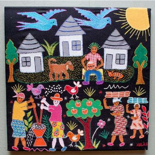 Ayoung,womanfounderwhomakesembroideredtextileswhichincludesbags,wall hangings and cushion covers. She has been participating in various development workshops run by the African Art Centre, particularly the ‘Amazwi Abesifazane’ and the‘Intokozo’group.