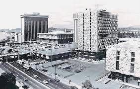 Banco de Guatemala siendo éste último, el edificio más alto para la época y se pueden observar los murales en alto relieve de Dagoberto Vázquez que describen la historia del país.
