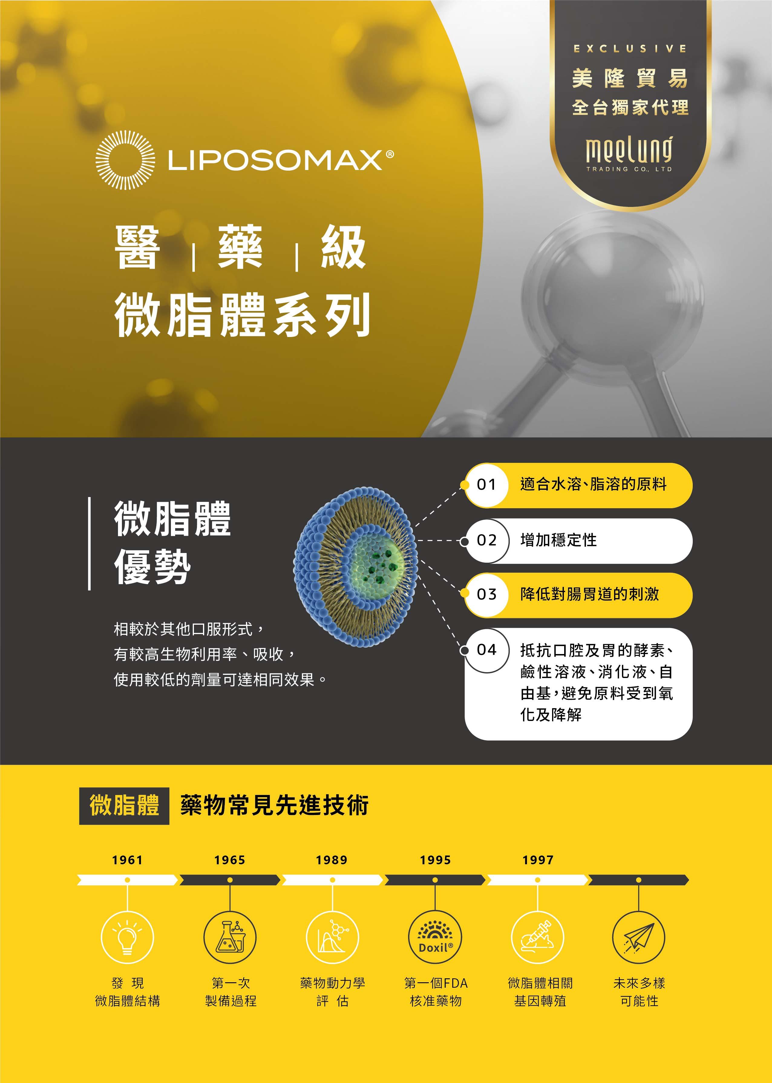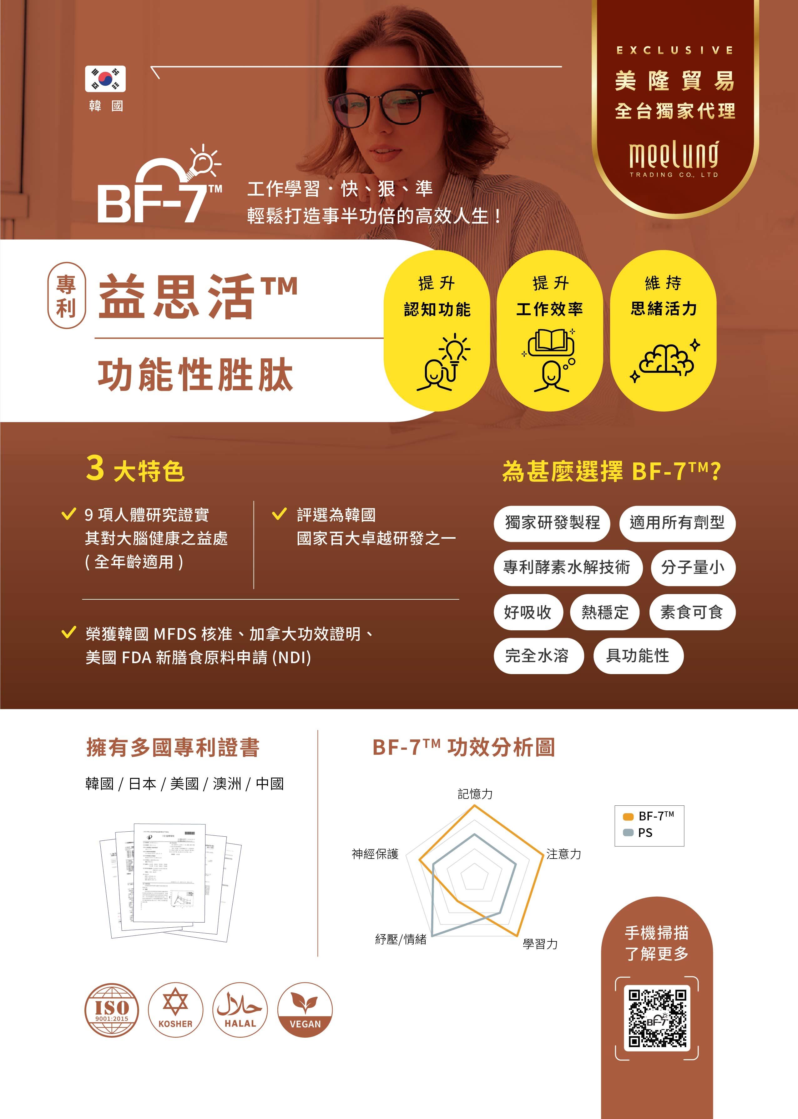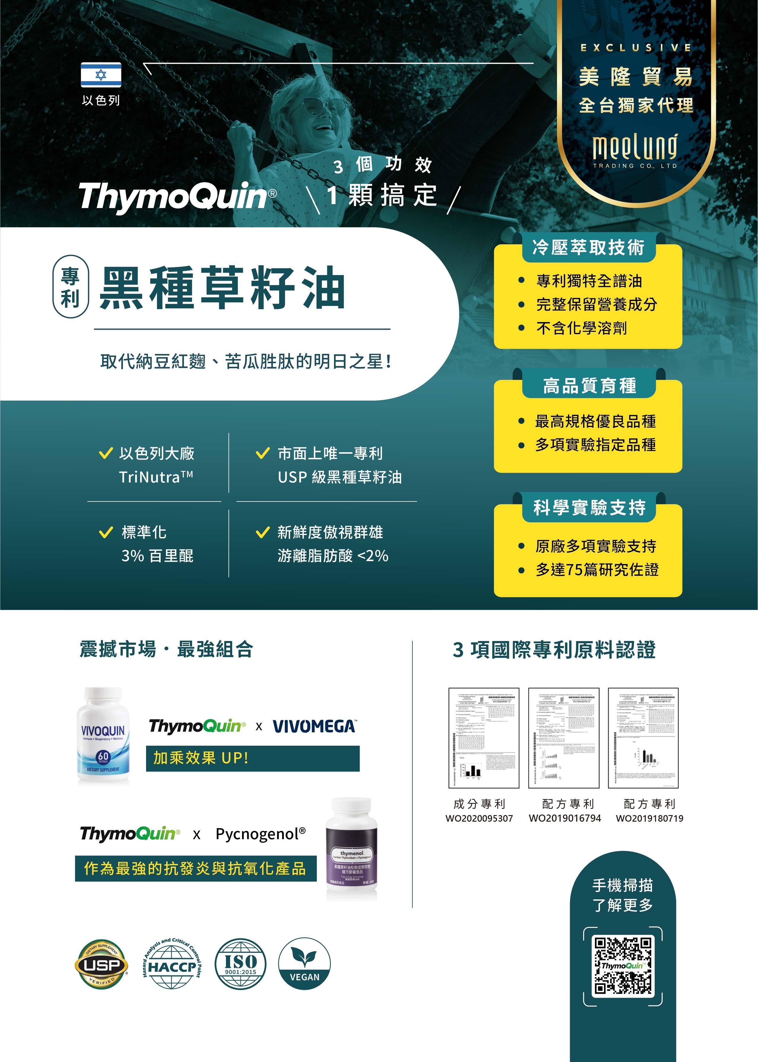【美隆貿易】業界經驗超過70年,為國內最專業創新的品牌保健原料供應商,積極從國外引進最新的專利品牌原料,提供精準獨特的保健食品配方設計以及提供專業化加值代工服務等,協助客戶在競爭激烈的市場上成為業界領頭羊。今年展出主打原料包含:VivoMega™挪威高濃度85%頂級魚油及70%純淨藻油、Liposomax™微脂體維生素C/D3/B群/穀胱甘肽、BF-7™專利益思活™功能性胜肽、ThymoQuin®以色列專利黑種草籽油。而此次主打配方以4大保健主題: 運動生活、養顏美容、天然營養、思緒樂活,探討營養素如何改善生活品質的全新定位。