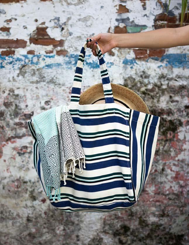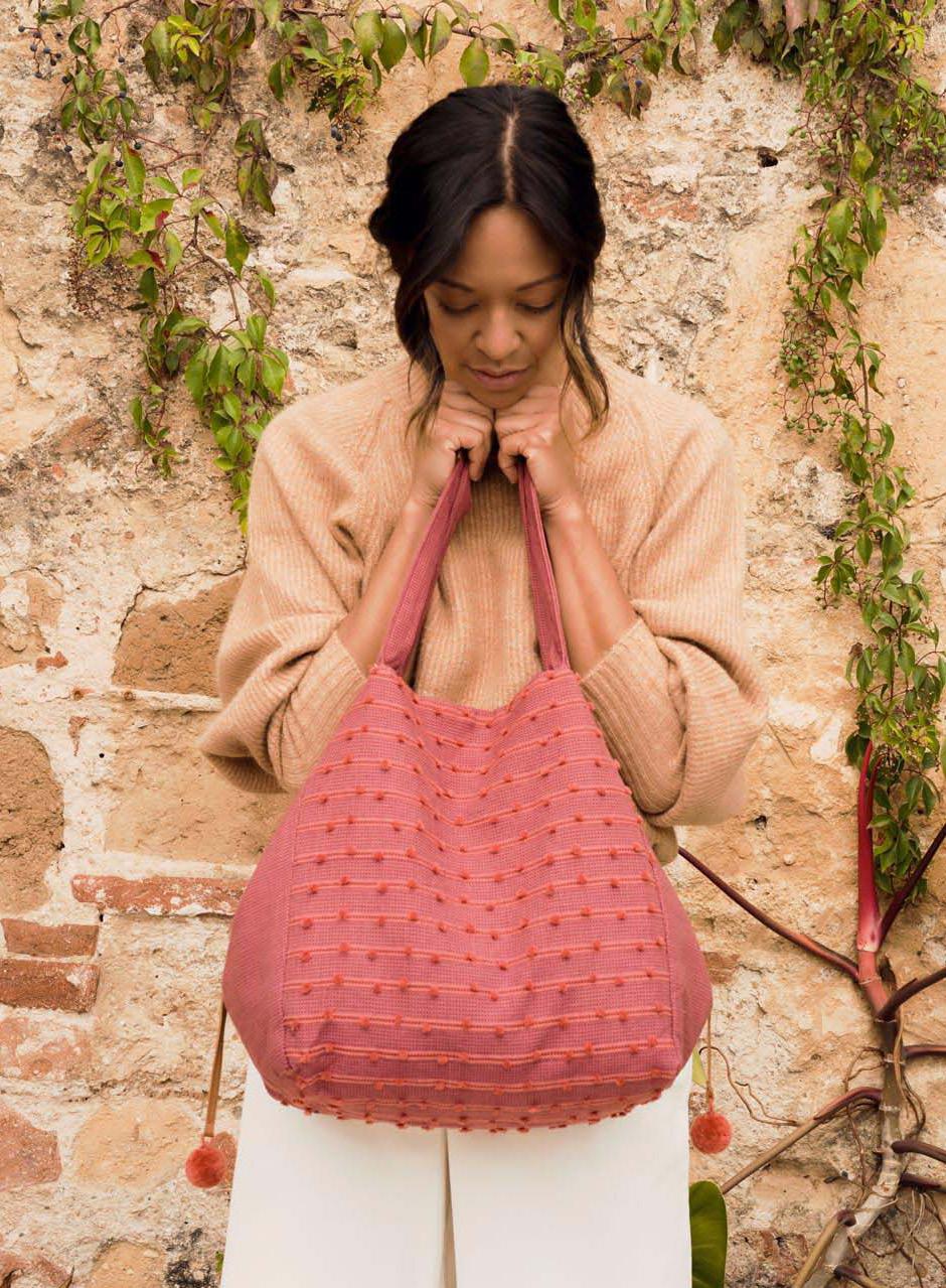 This tote also has a hidden long strap for function. I developed the coiled handle to showcase the handmade nature of the product. When merchandising the collection as a whole, the handle connects back to the circular handles and twisted cotton fringe.