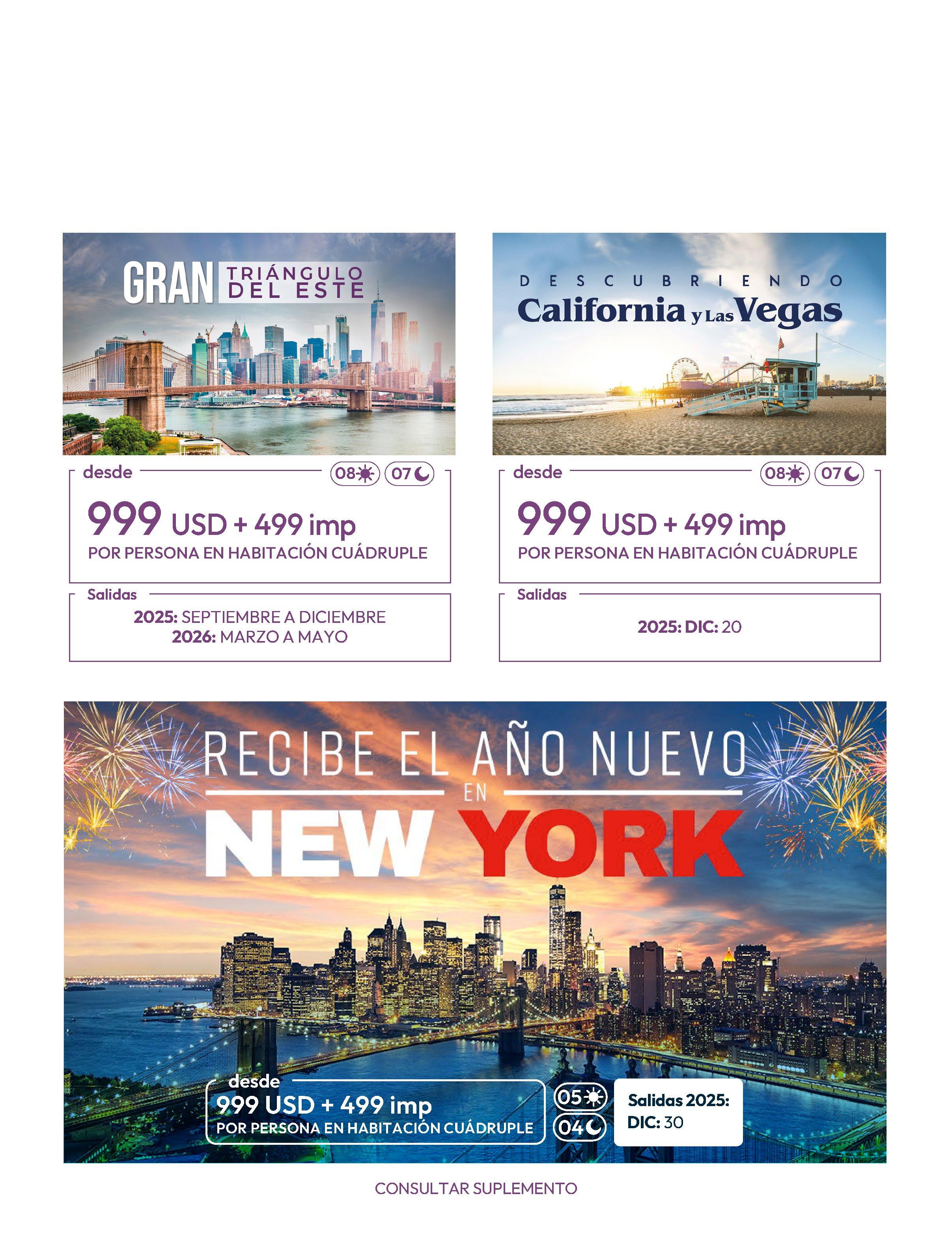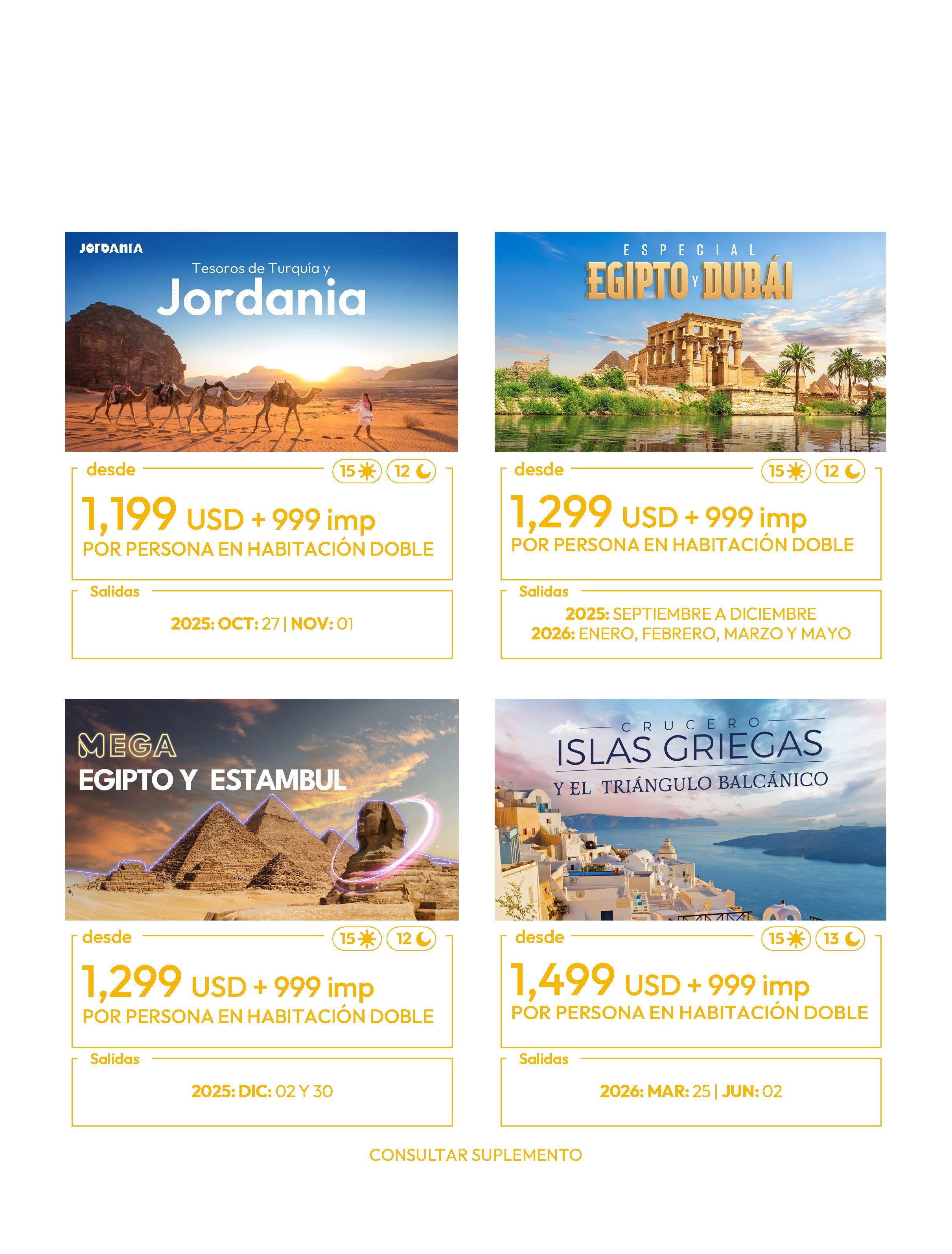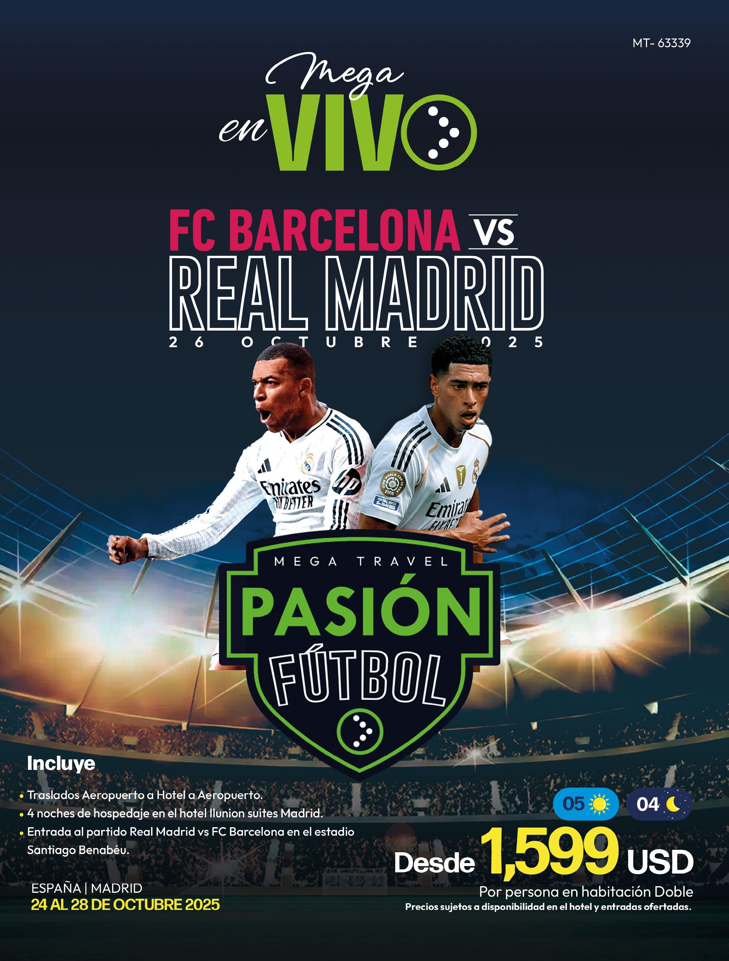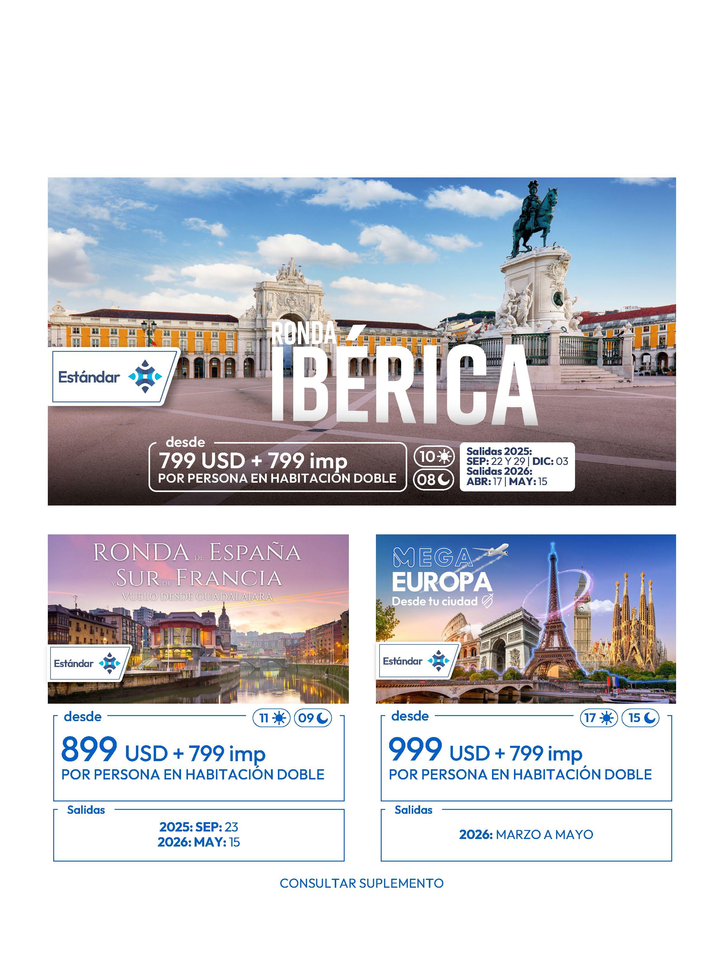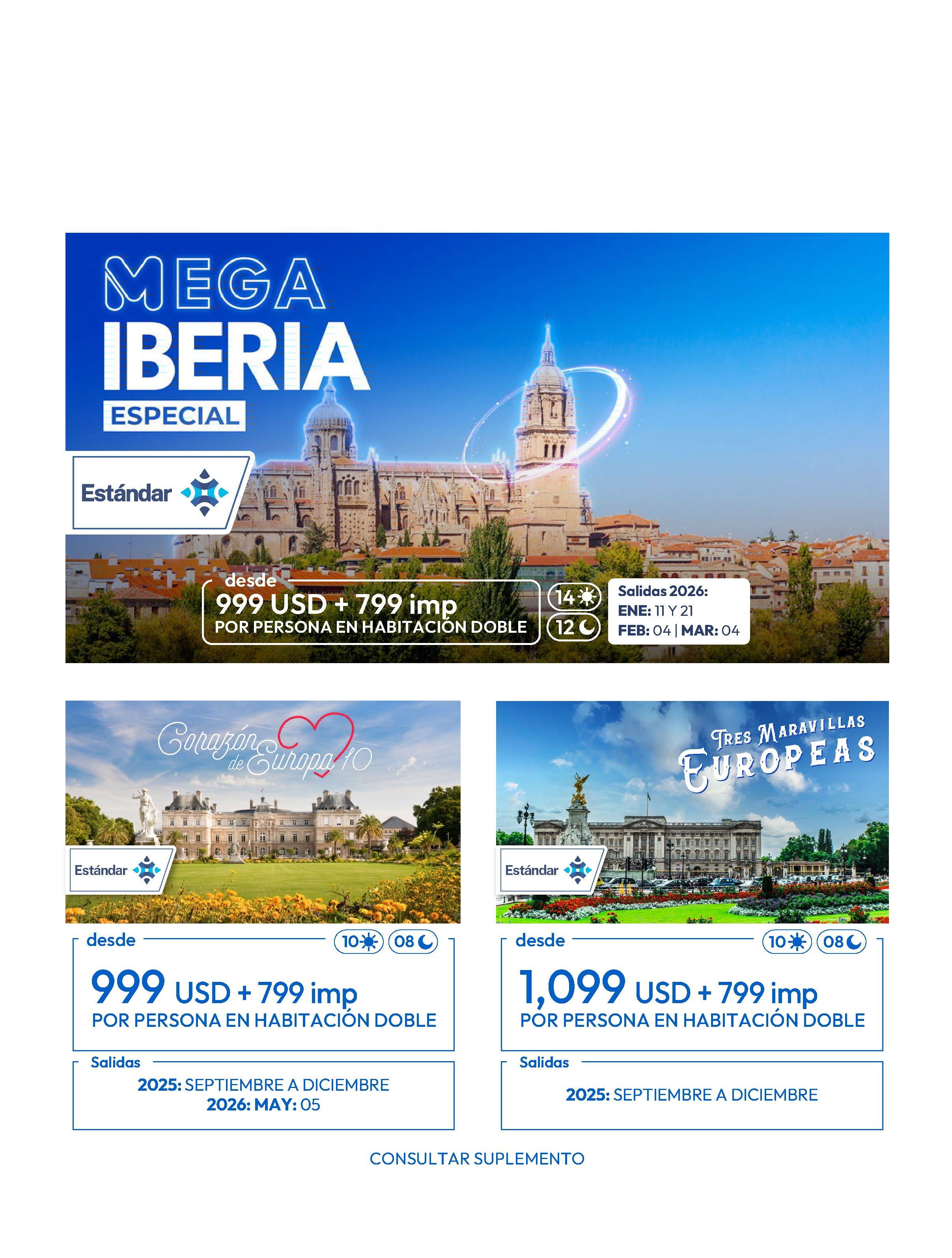 Con igual alegría, presentamos el programa Hola Europa, un recorrido vibrante que combina cultura, estilo y esa esencia que tanto enamora del continente. Además, se suma Mega Portugal, un nuevo tour de la línea MEGA que invita a descubrir Lisboa, Fátima, Coimbra y Oporto, ciudades que conquistan con su riqueza histórica, espiritualidad y el encanto de sus paisajes.