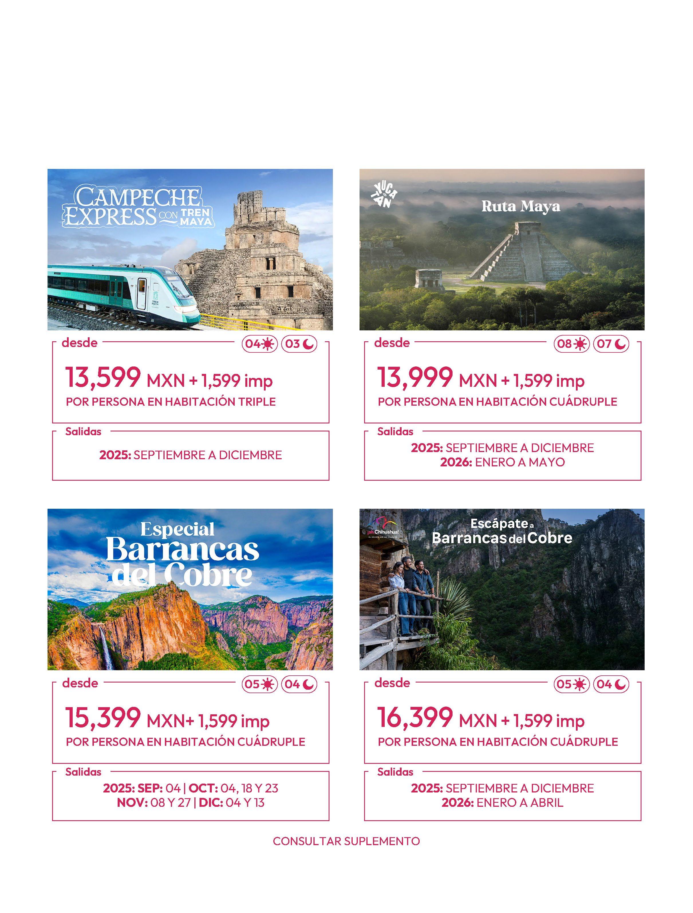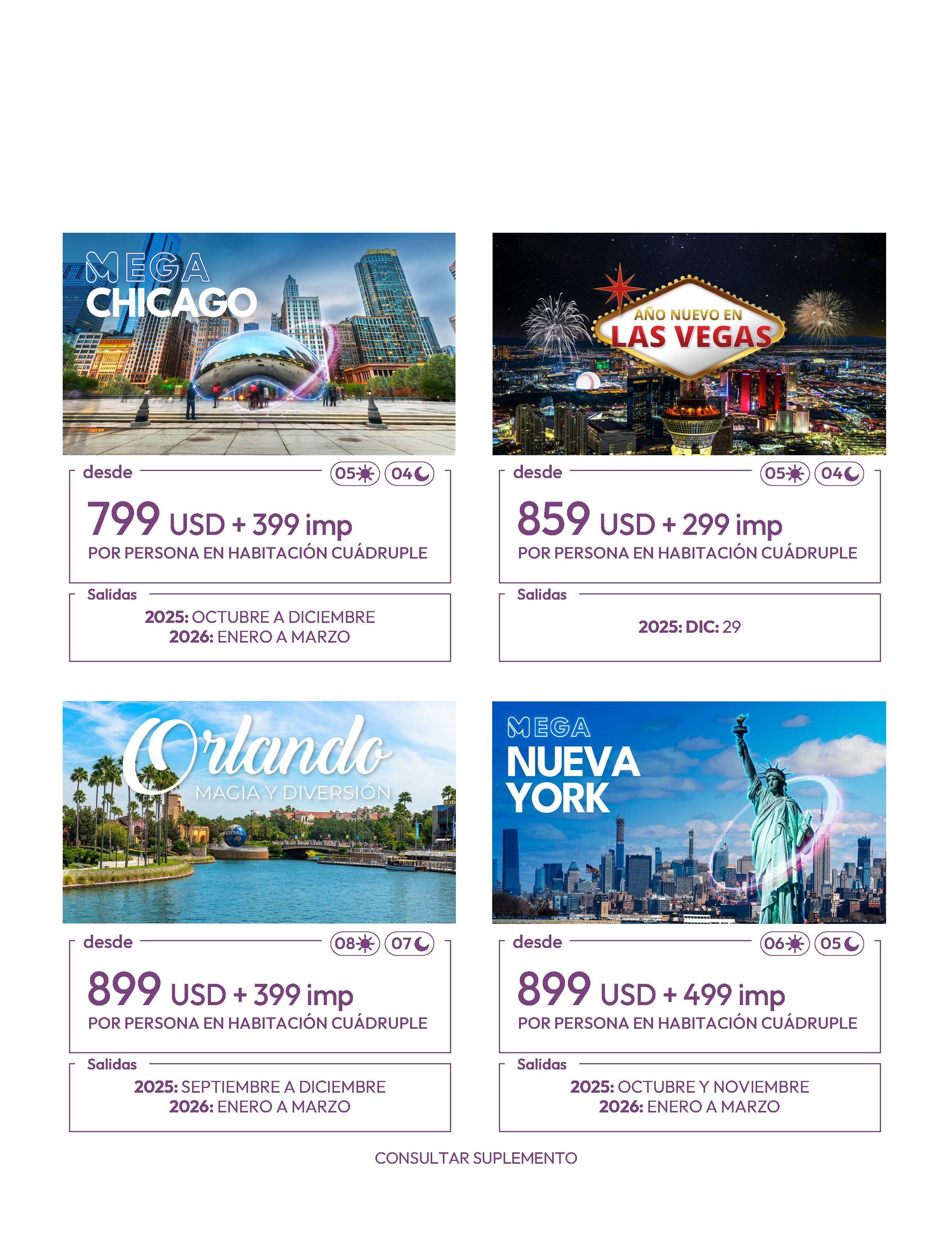 Todos los paquetes descritos en esta publicación incluyen lo siguiente (de acuerdo a itinerario)
