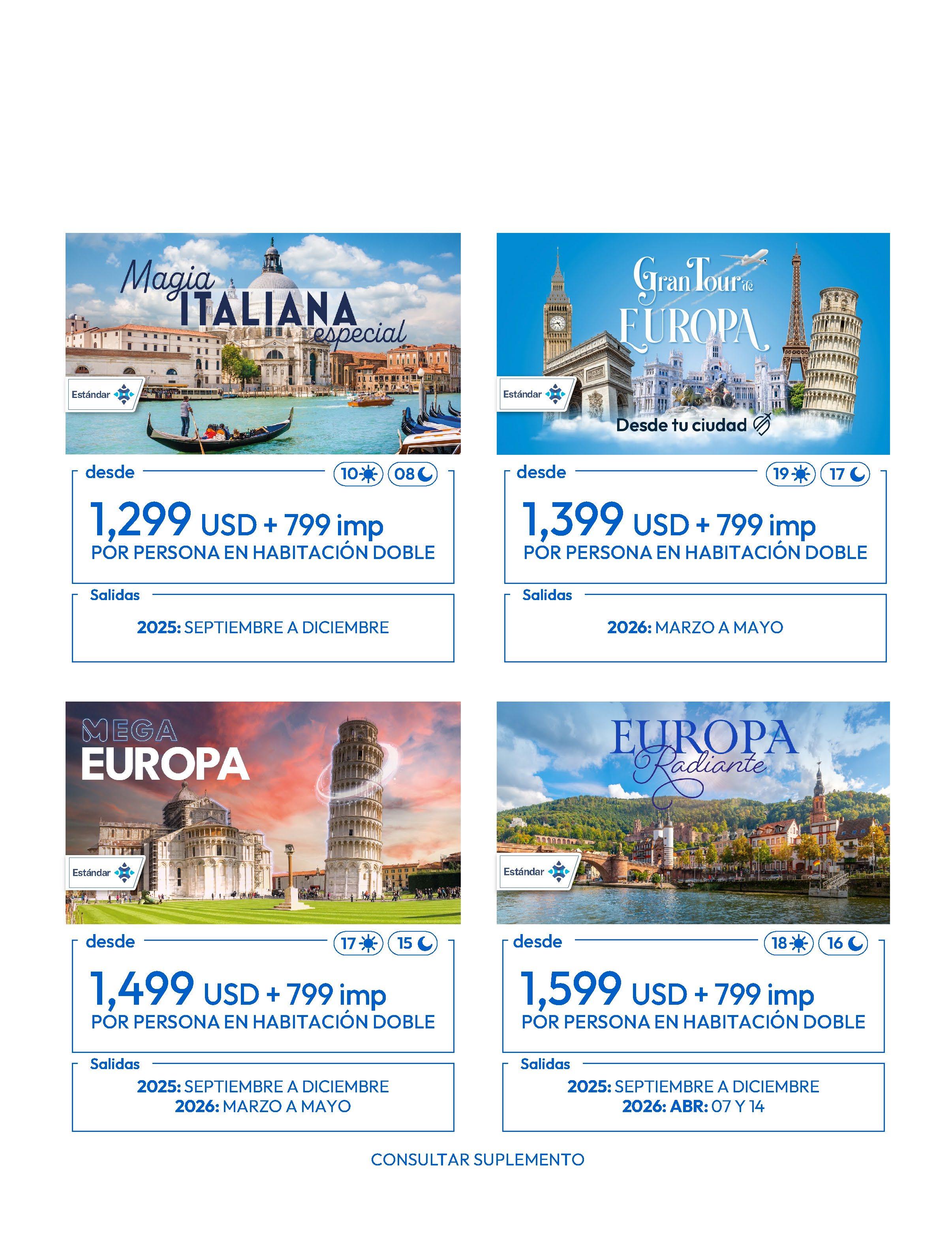 Este mes llega una noticia que nos llena de entusiasmo, Volamos a Europa desde tu ciudad, los pasajeros podrán elegir salir desde la zona Norte, Occidente, Centro, Sur o Golfo para disfrutar dos programas icónicos, el Gran Tour de Europa y el Mega Europa. Ambos itinerarios conservan la esencia Mega Travel con ciudades llenas de historia, logística impecable y la calidez que convierte cada viaje en algo inolvidable. La diferencia es clara, hoy Europa está más cerca que nunca, con la facilidad de elegir el punto de partida más cómodo para cada viajero.