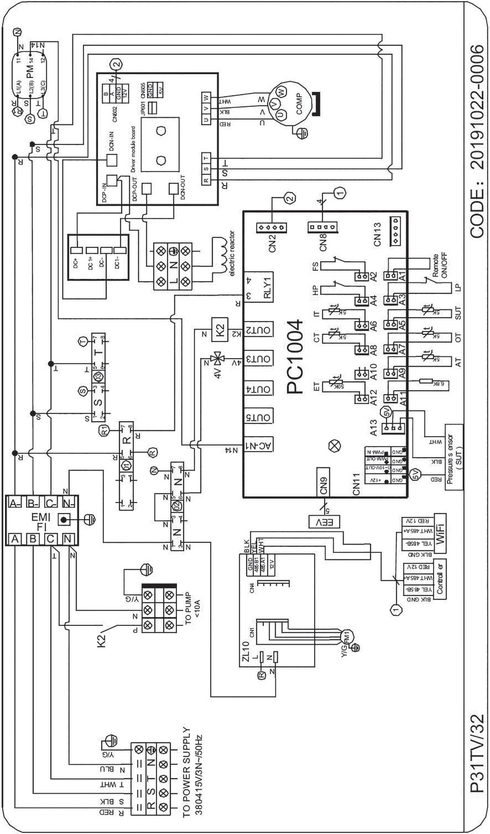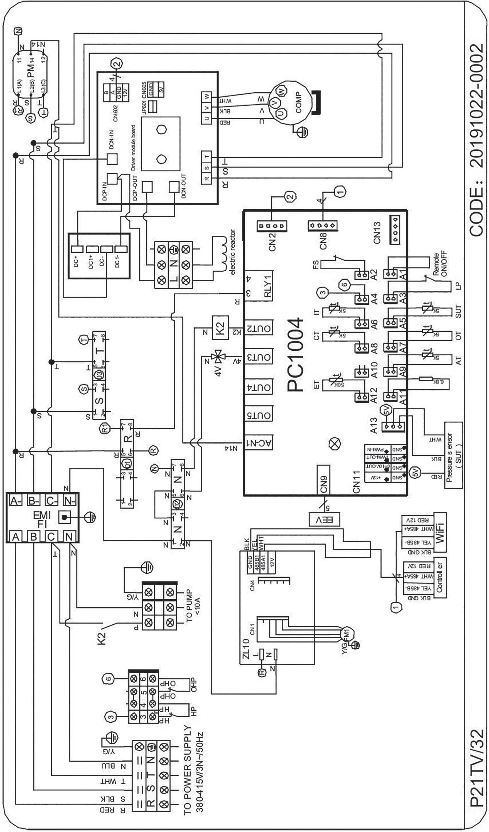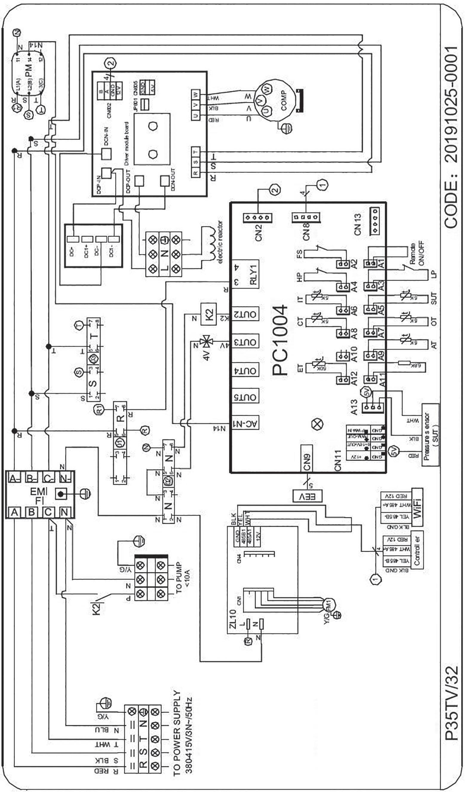 AT Omgivan de temperatur COMP Kompressor CT spolens temperatur EEV Elektronisk exp ansionsventil ET Avgasstemperatur FM flÀktmotor FS flödesbrytare HP Högtryc ksskydd IT Inloppsvattentemperatur K2 RelÀ pÄ pump LP LÄgtrycksskydd OT Utloppsvattentemperatur PM fasmonitor SUT Sugtemperatur 4V 4-vÀgsventil