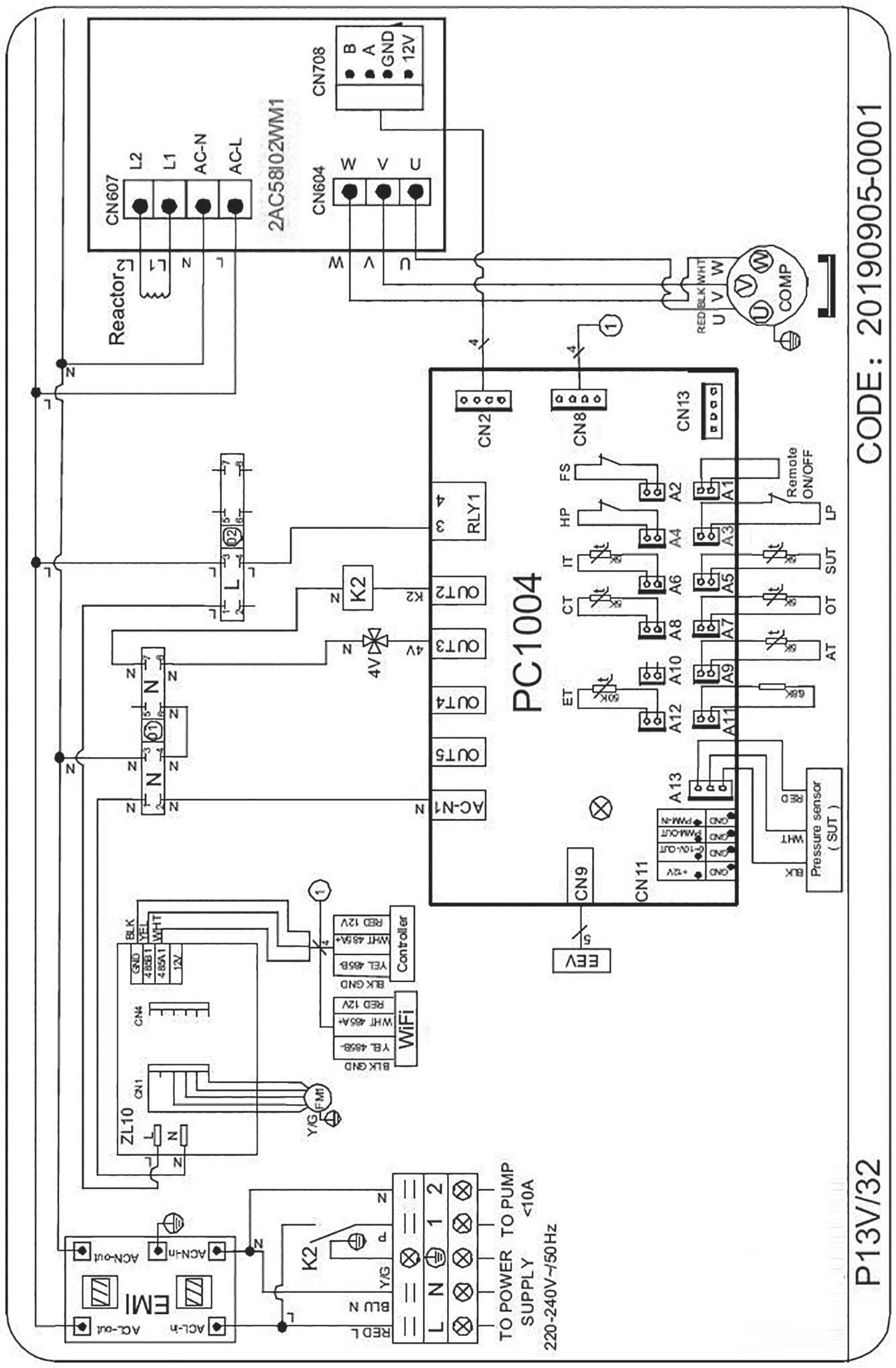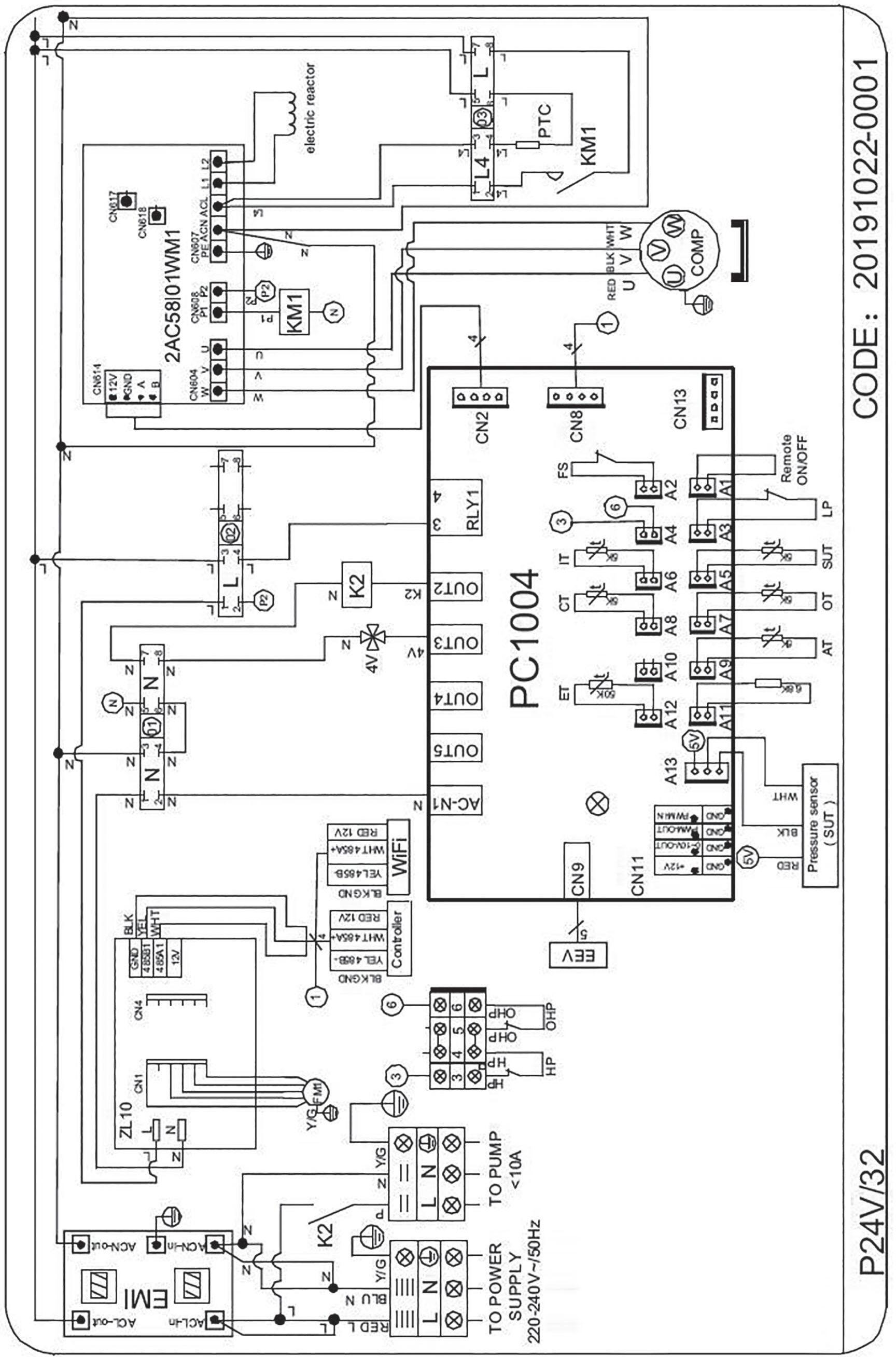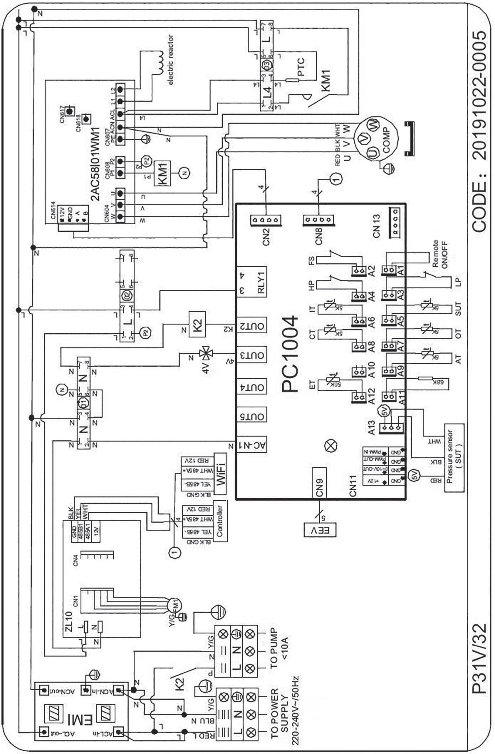 AT Omgivan de temperatur COMP Kompressor CT spolens temperatur EEV Elektronisk exp ansionsventil ET Avgasstemperatur FM flÀktmotor FS flödesbrytare HP Högtryc ksskydd IT Inloppsvattentemperatur K2 RelÀ pÄ pump LP LÄgtrycksskydd OT Utloppsvattentemperatur PM fasmonitor SUT Sugtemperatur 4V 4-vÀgsventil