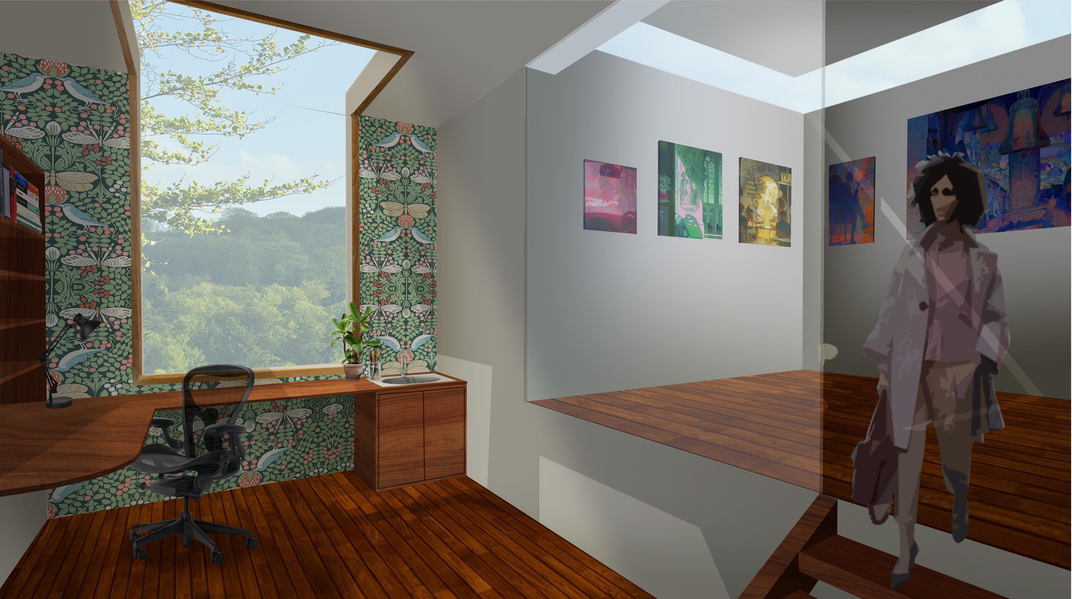 Sierra Flores is a 28 year old Peruvian American female. She was born in New York City, USA and currently resides in the mountains outside of Madrid. Her Peruvian culture is very important to her, so it was important to showcase her heritage inside the space. Flores is a mixed media artists who creates art using acrylic paint, pens, pencils, and digital means. Her hobbies include reading and horticulture. Natural light is essential to the space in order to look after her plants and keep her motivated to work throughout the day.