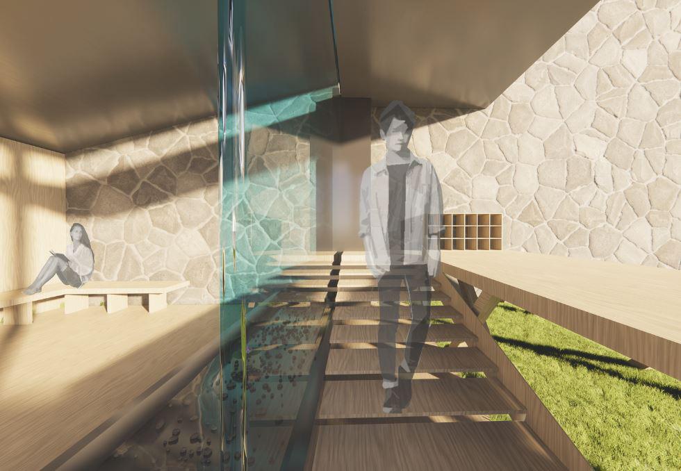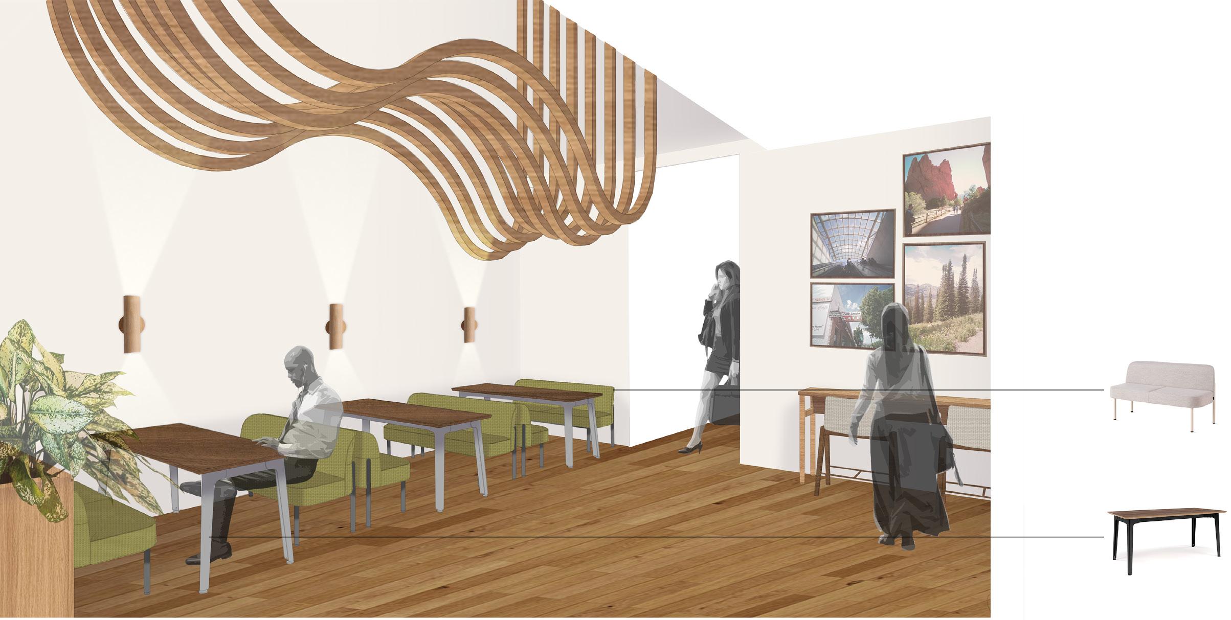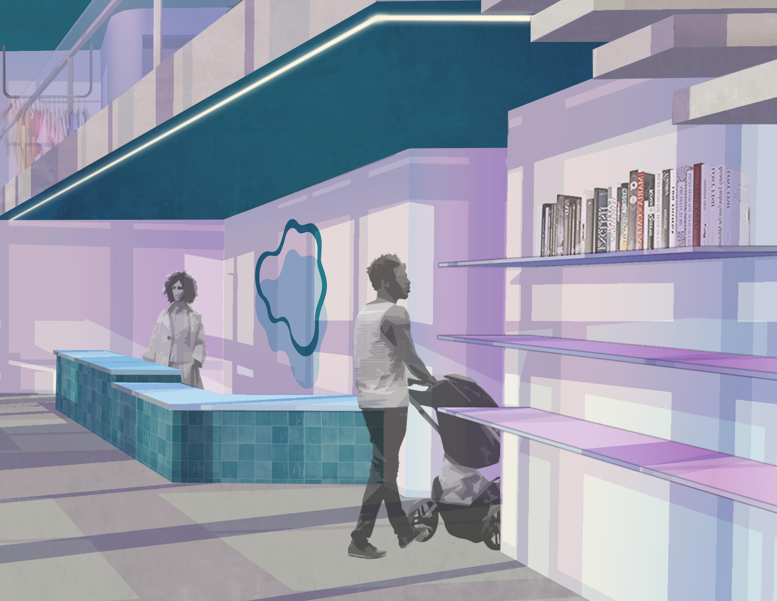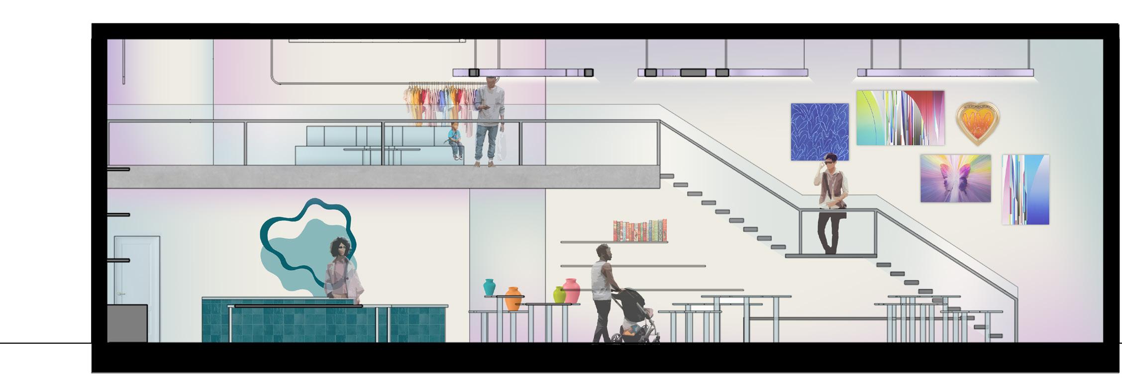 Products sold in Therme include locally handmade jewelry, pottery, prints, books, fine arts, and clothing. As seen in the perspectives and sections, the art is a part of the design of the space.