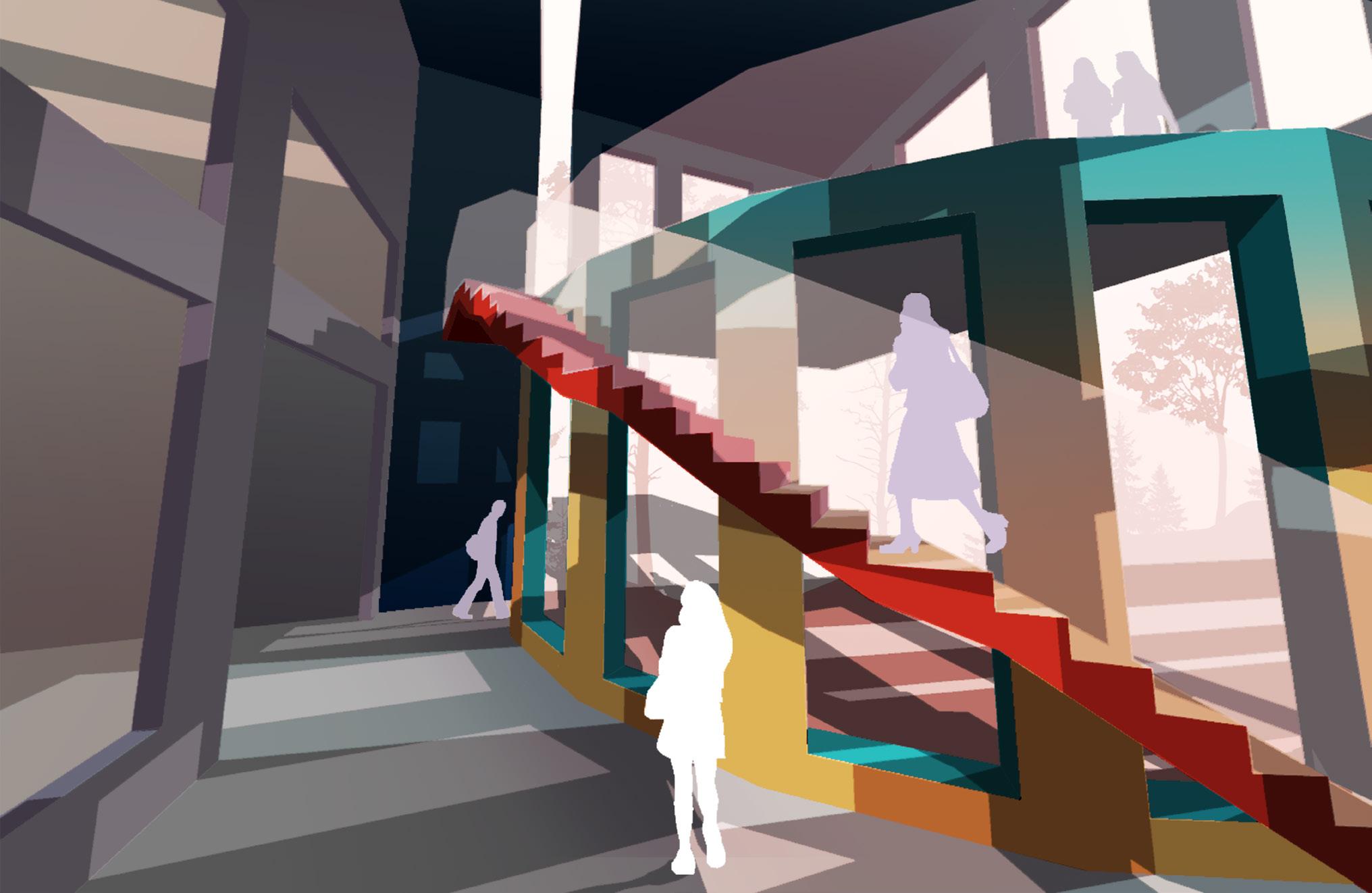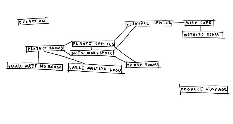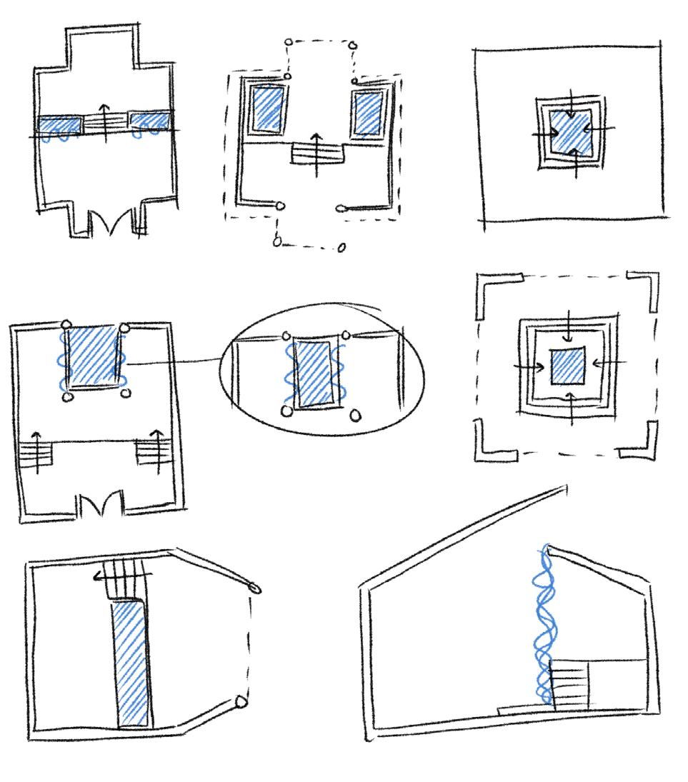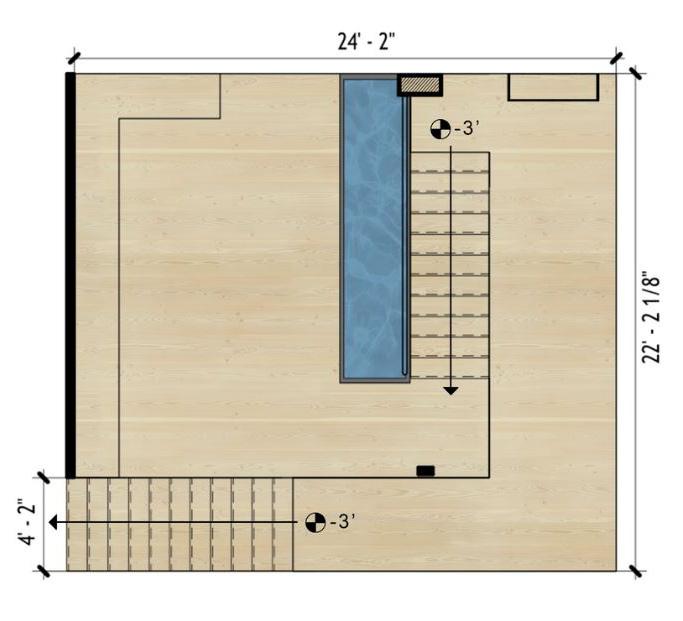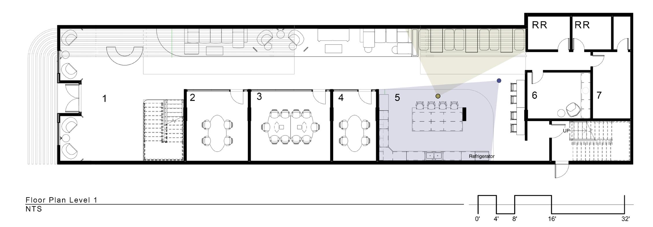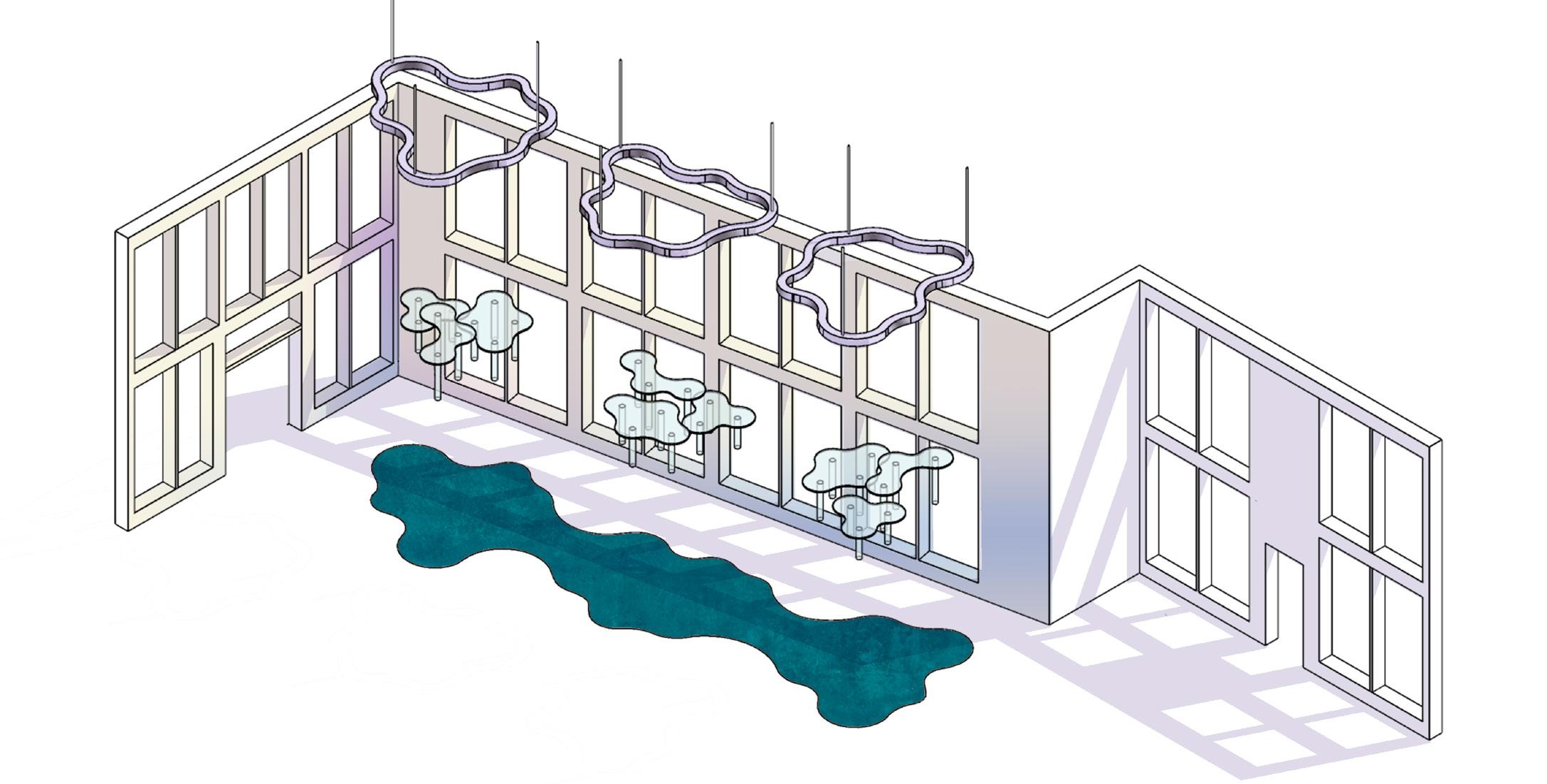 Multiple Parti diagrams were created to determine the ideal layout of the space, considering adjacency, egress, and accessibility. Ultimately the design was organized around a diagonal grid.