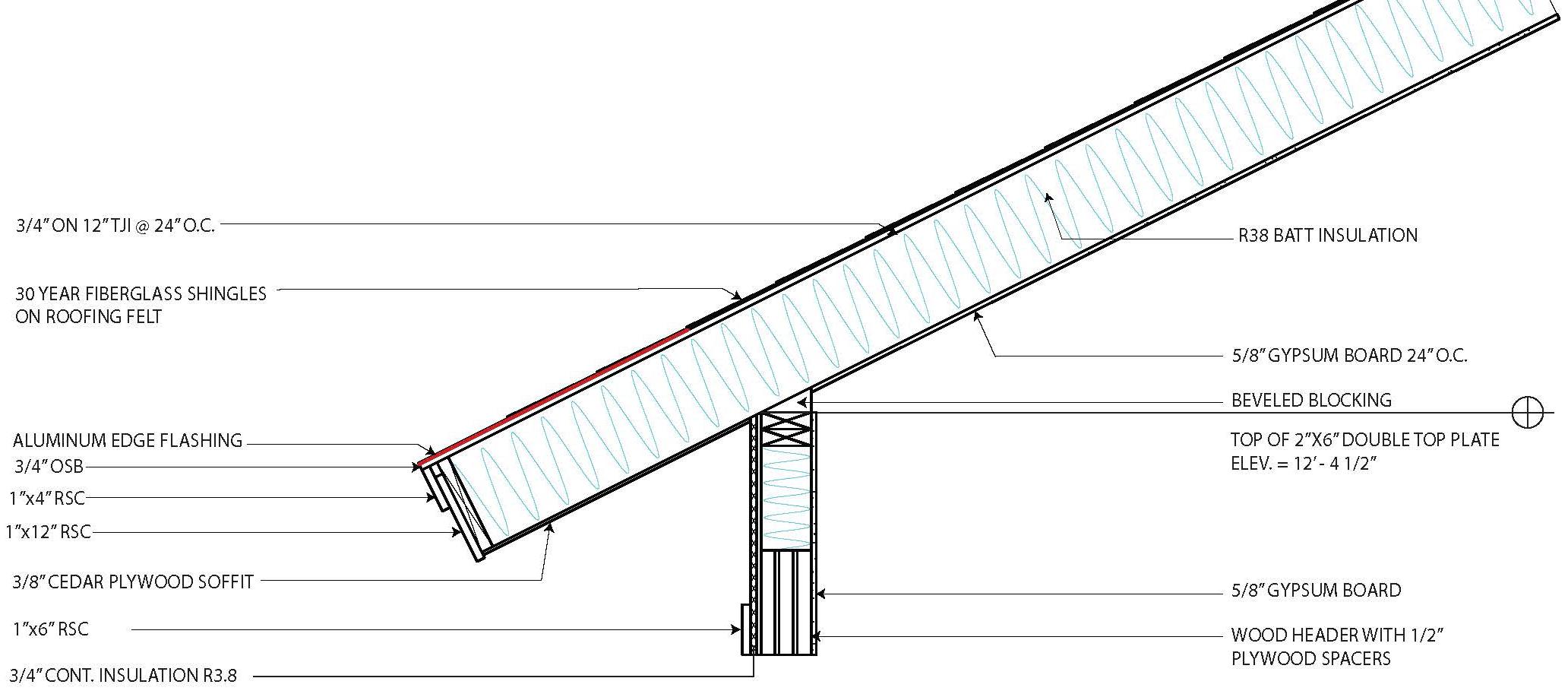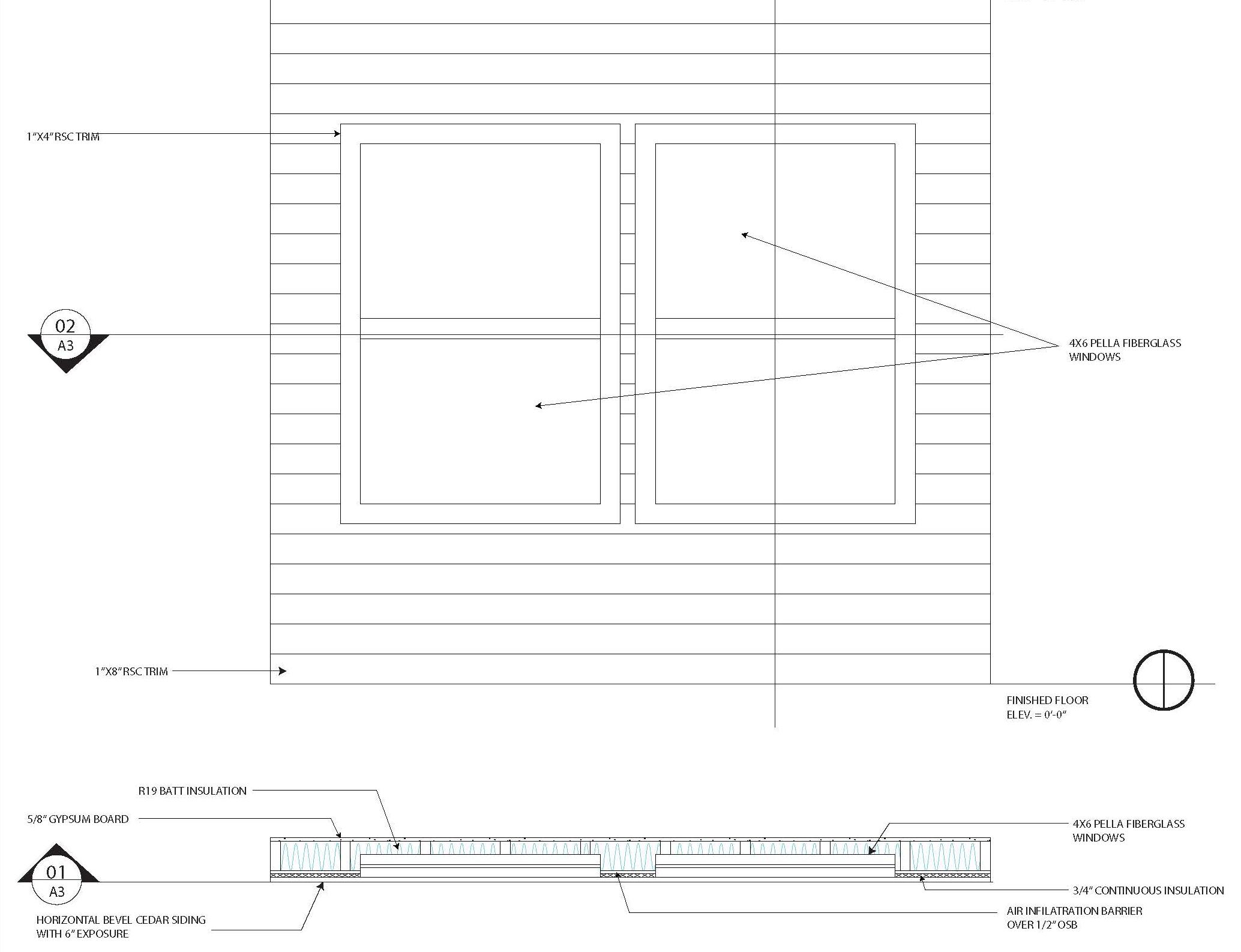 This project is a basic wood frame residence with the drawings highlighting the roof cross section, the wall with window section, a plan view, and an elevation view.