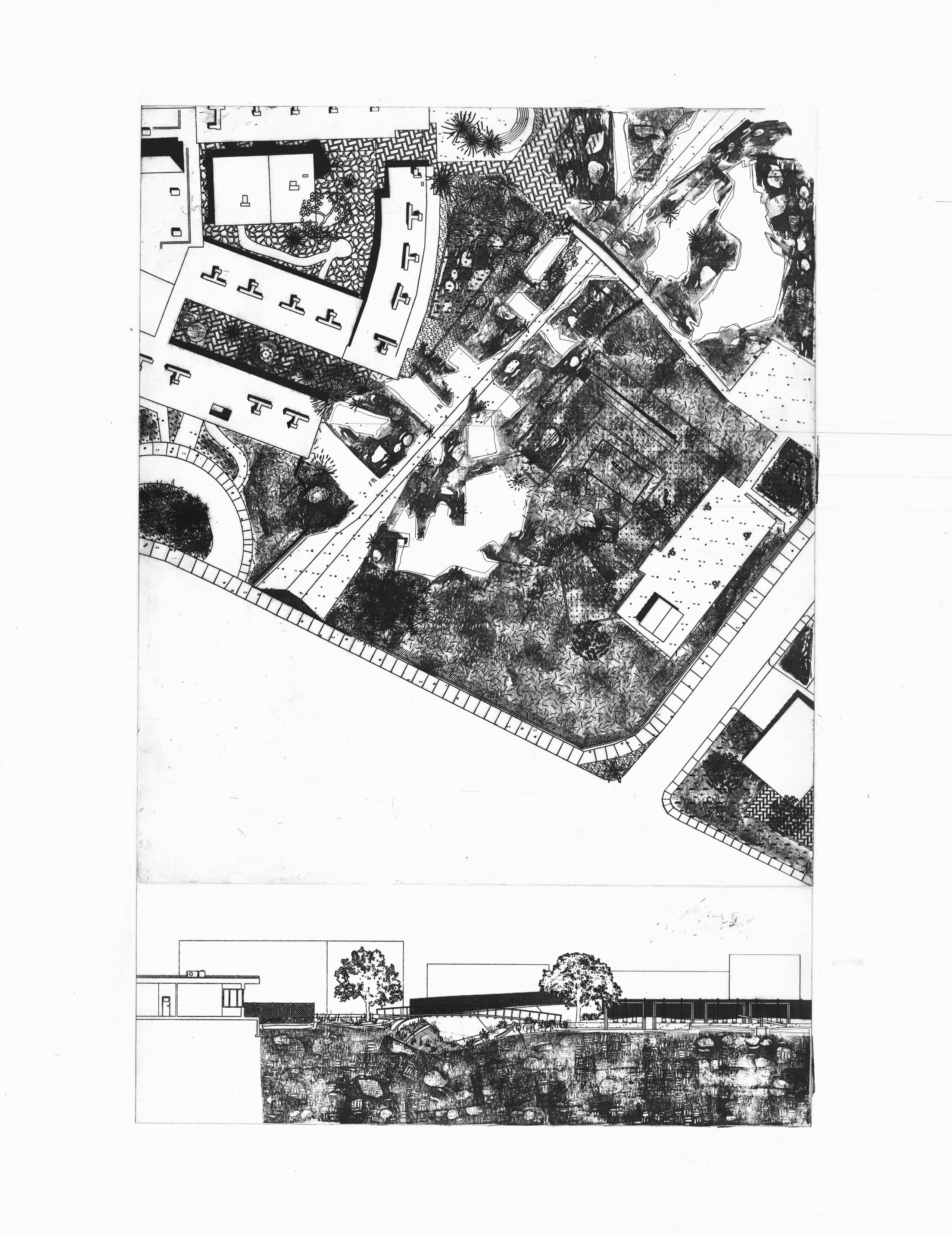 In cultivating these imagined futures, stamp printing techniques are once again utilized to help enable a hands on process to visualize the movement and “reassignment” of materials found on site – and how that can facilitate water absorption and land regeneration both in plan and section.