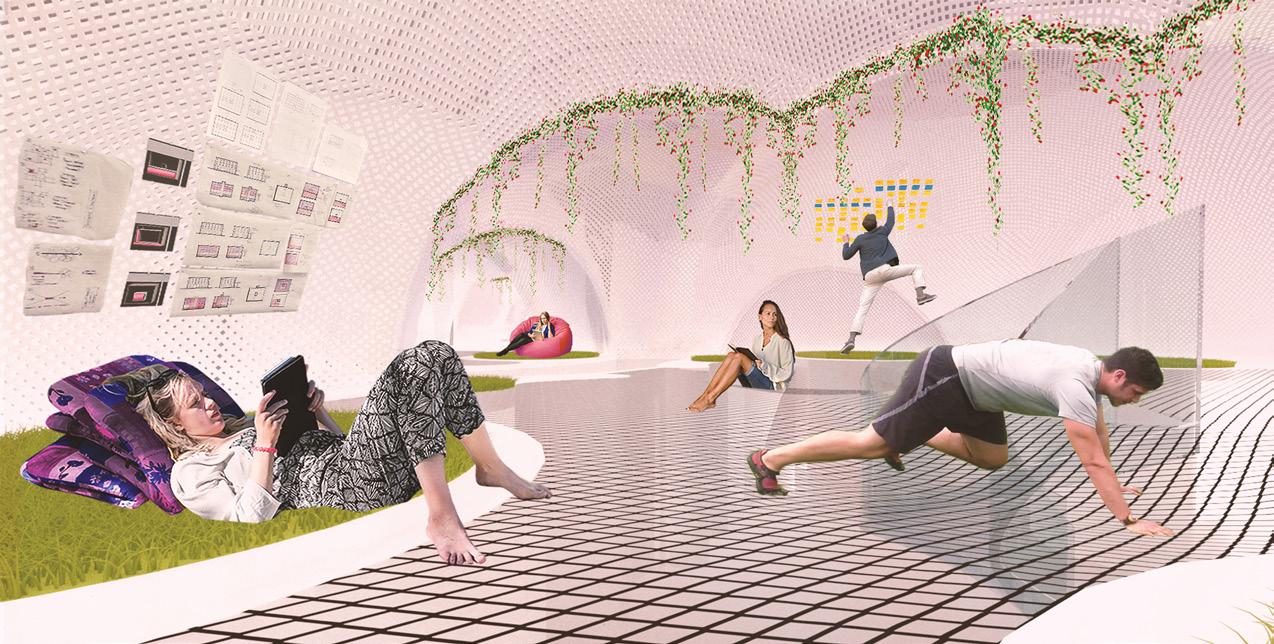 A VR research center for a tech start-up located in San Francisco, the Magic Attic is a place for uninhibited creative exploration. The unusual slopes and spaces of the Attic serve as in-house test labs for VR, AR, and mixedreality programs that will be used in a variety of real-world environments. They also allow for greater floor-to-floor visibility, increasing the likelihood of intra-workplace collaboration.
