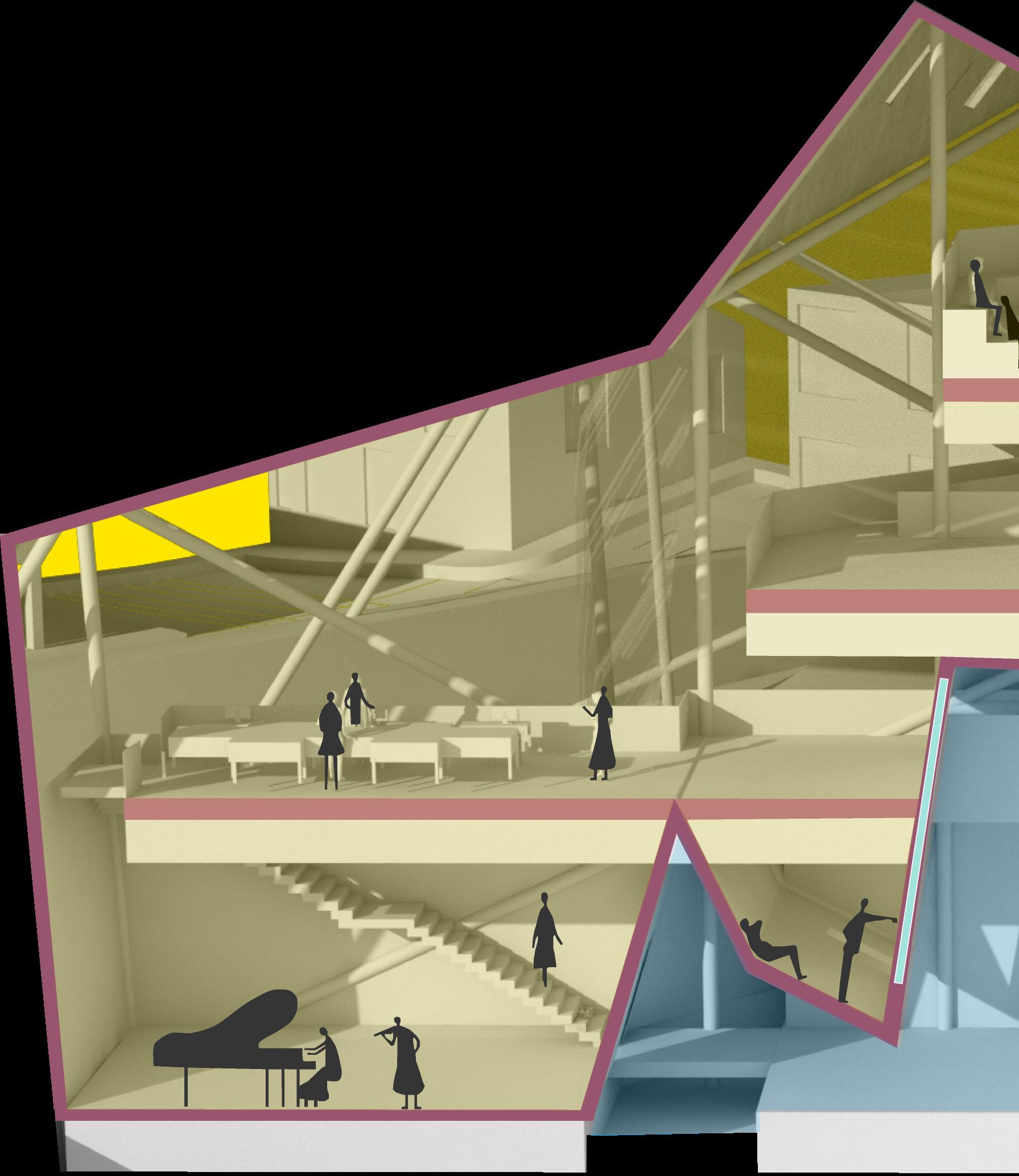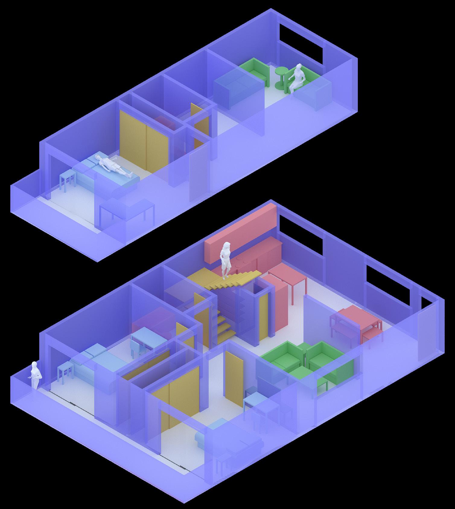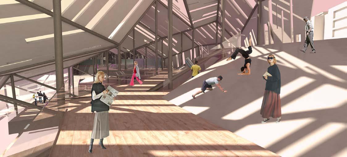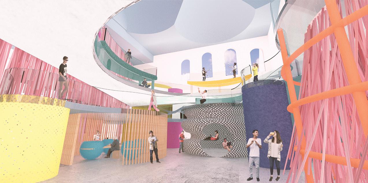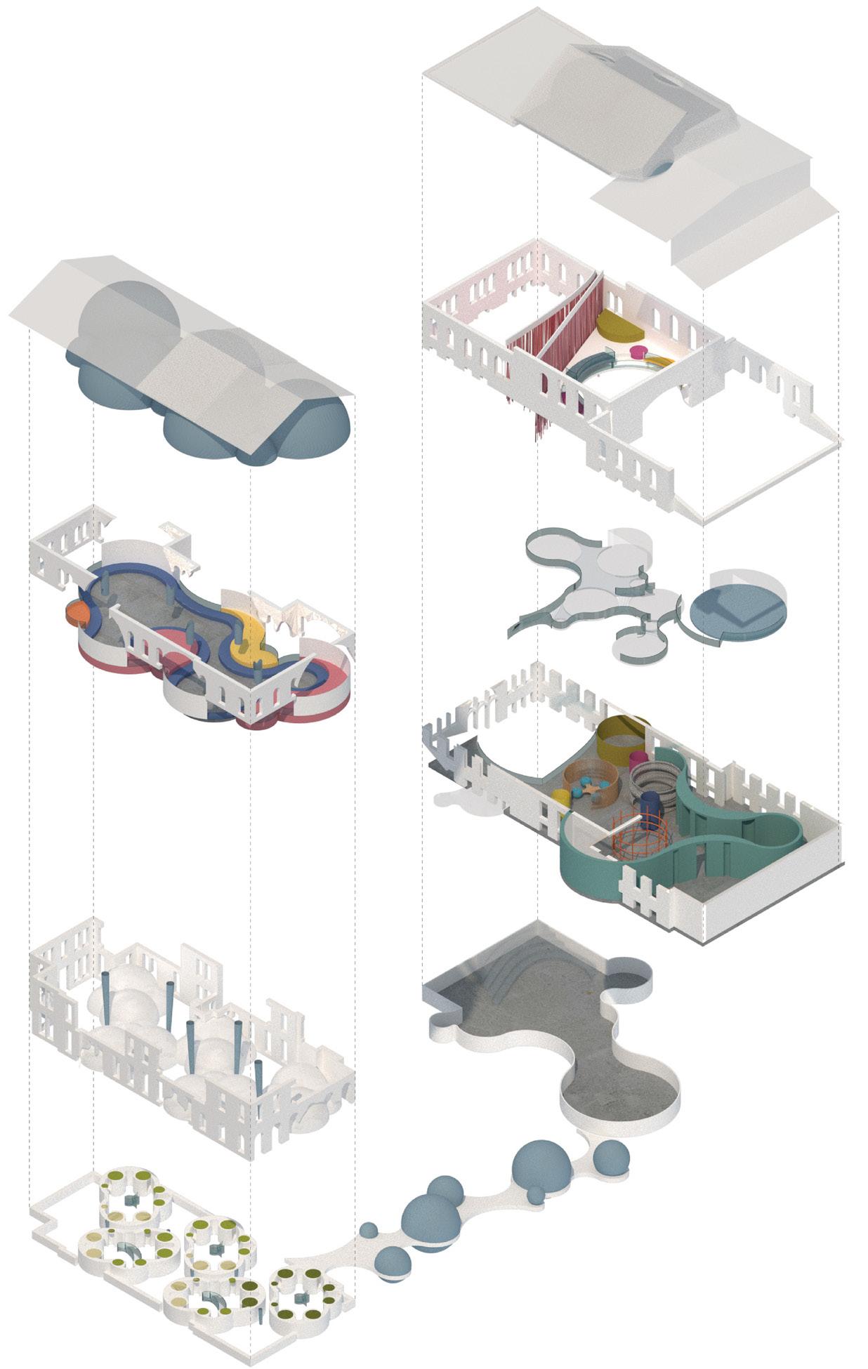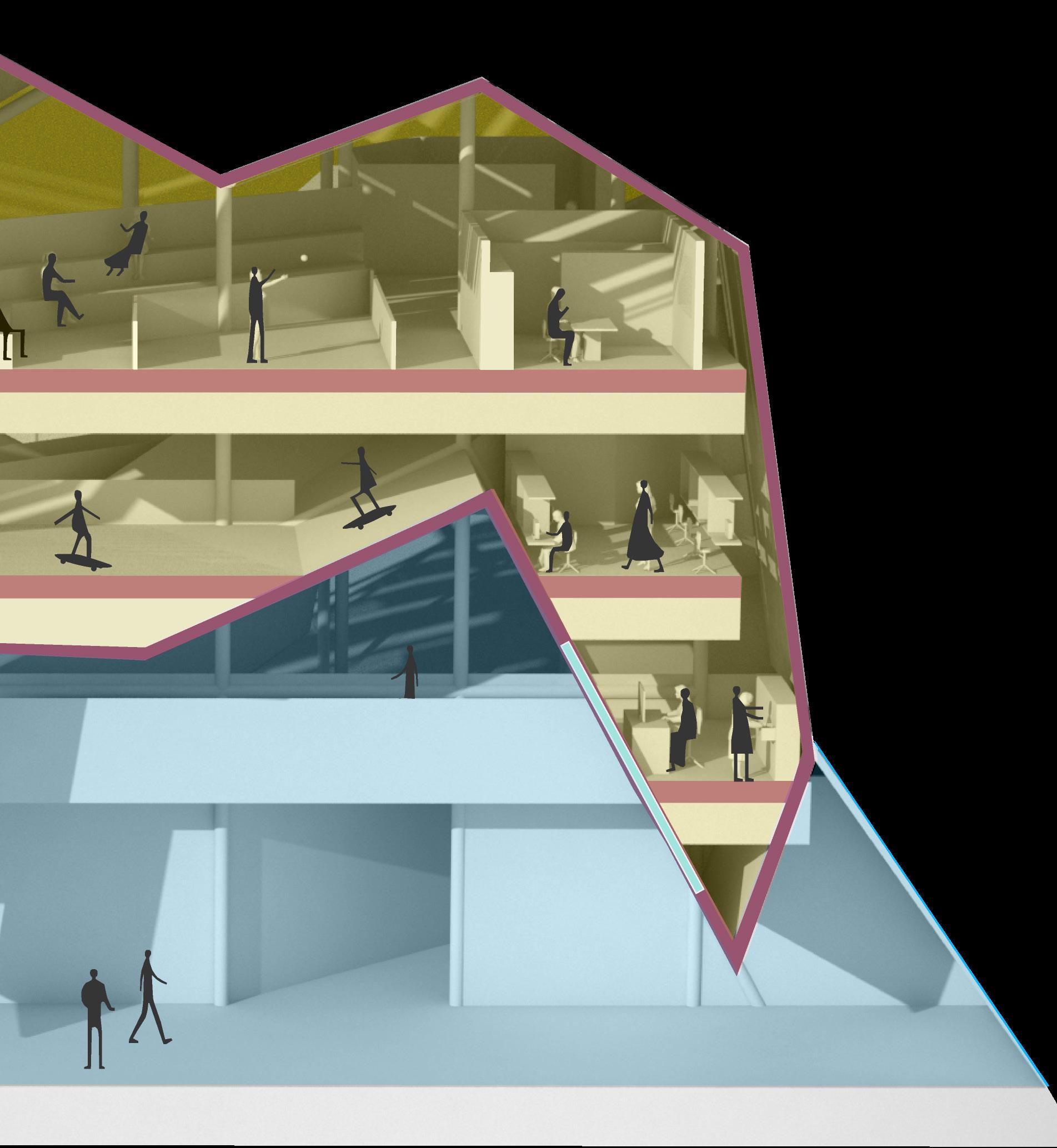 Two unoccupied buildings in Boston are repurposed as a community college for neurodivergent students. Conventional features, which call for conventional modes of occupation from users, are subverted by “divergent” interventions, which encourage a departure from convention and flexible interpretation of the environment.