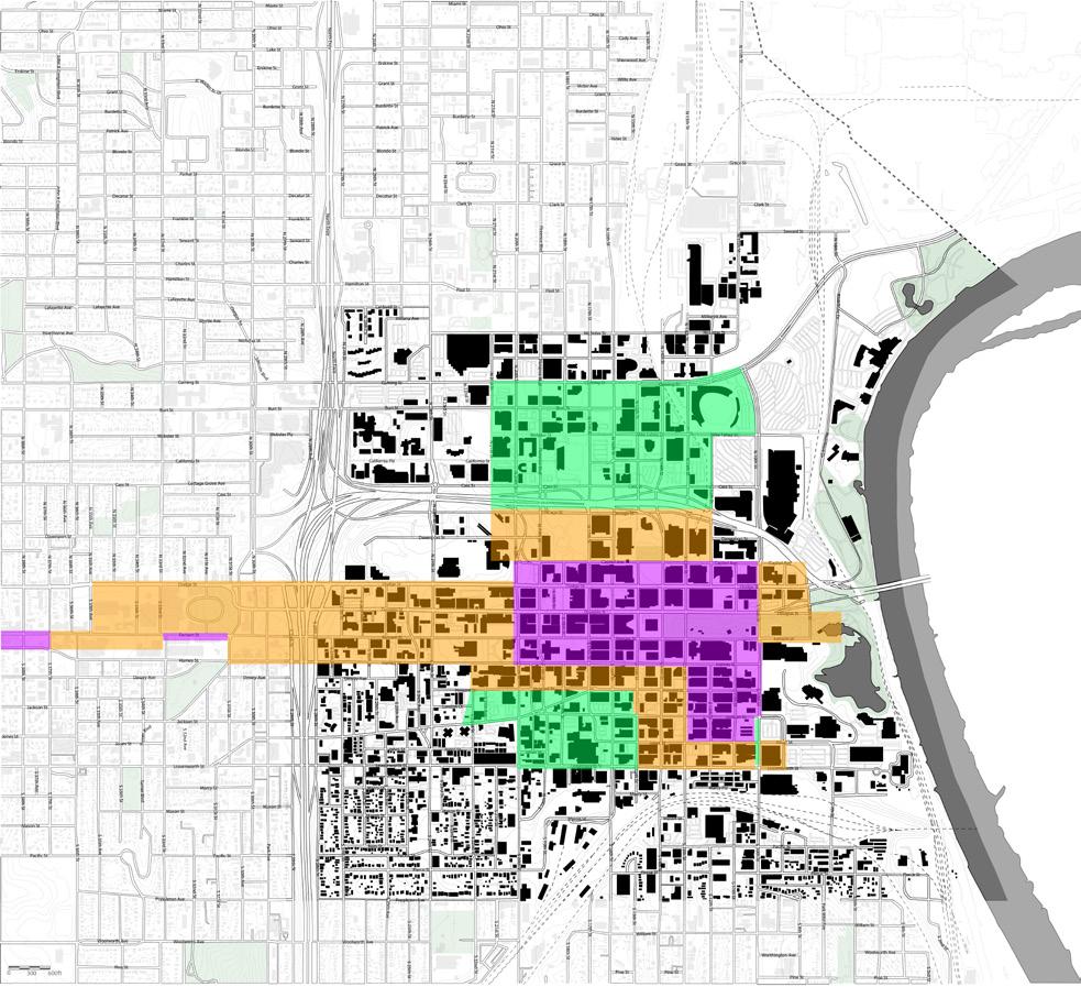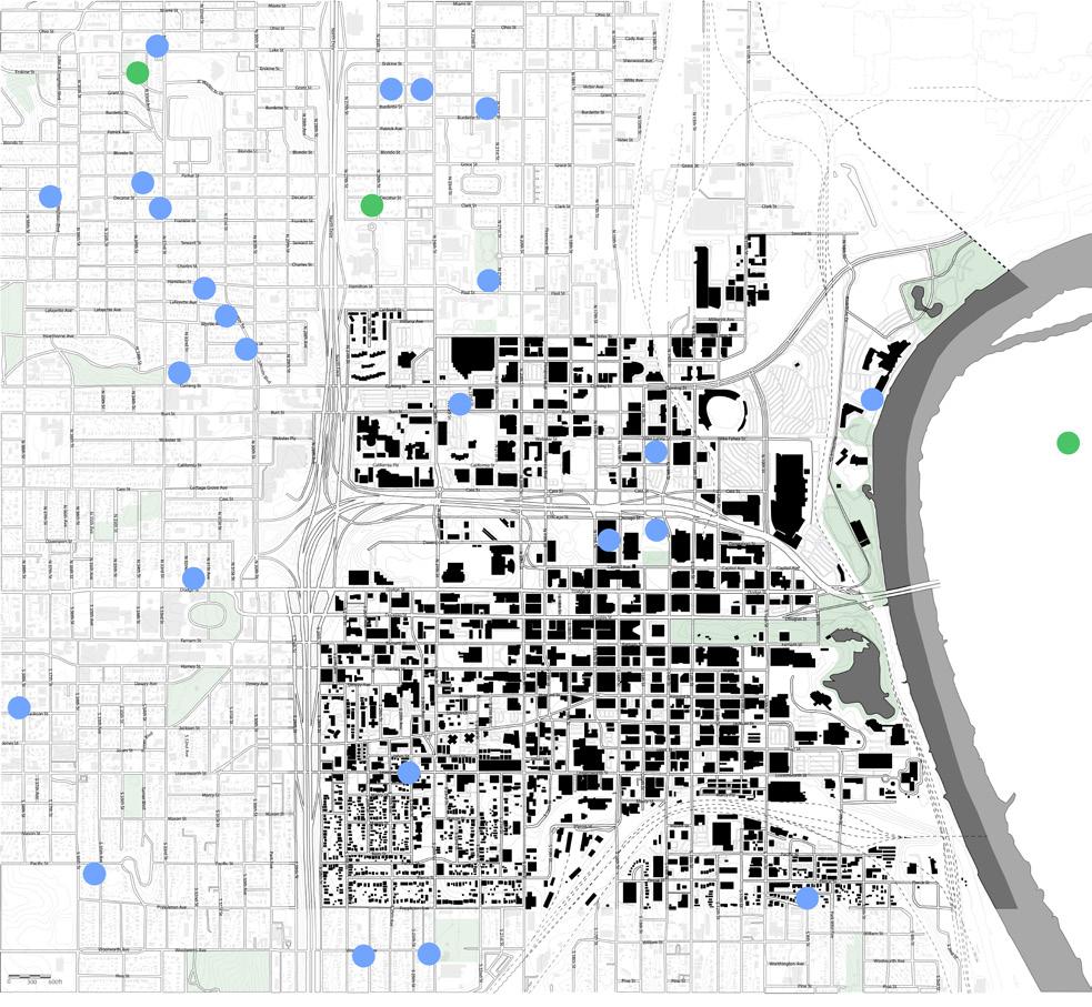 As part of a site analysis for a proposed headquarters in downtown Omaha, I contributed to evaluating critical factors, set forth by the client, such as parking availability and types, proximity to schools and day cares, and the relationship to nearby historical sites.