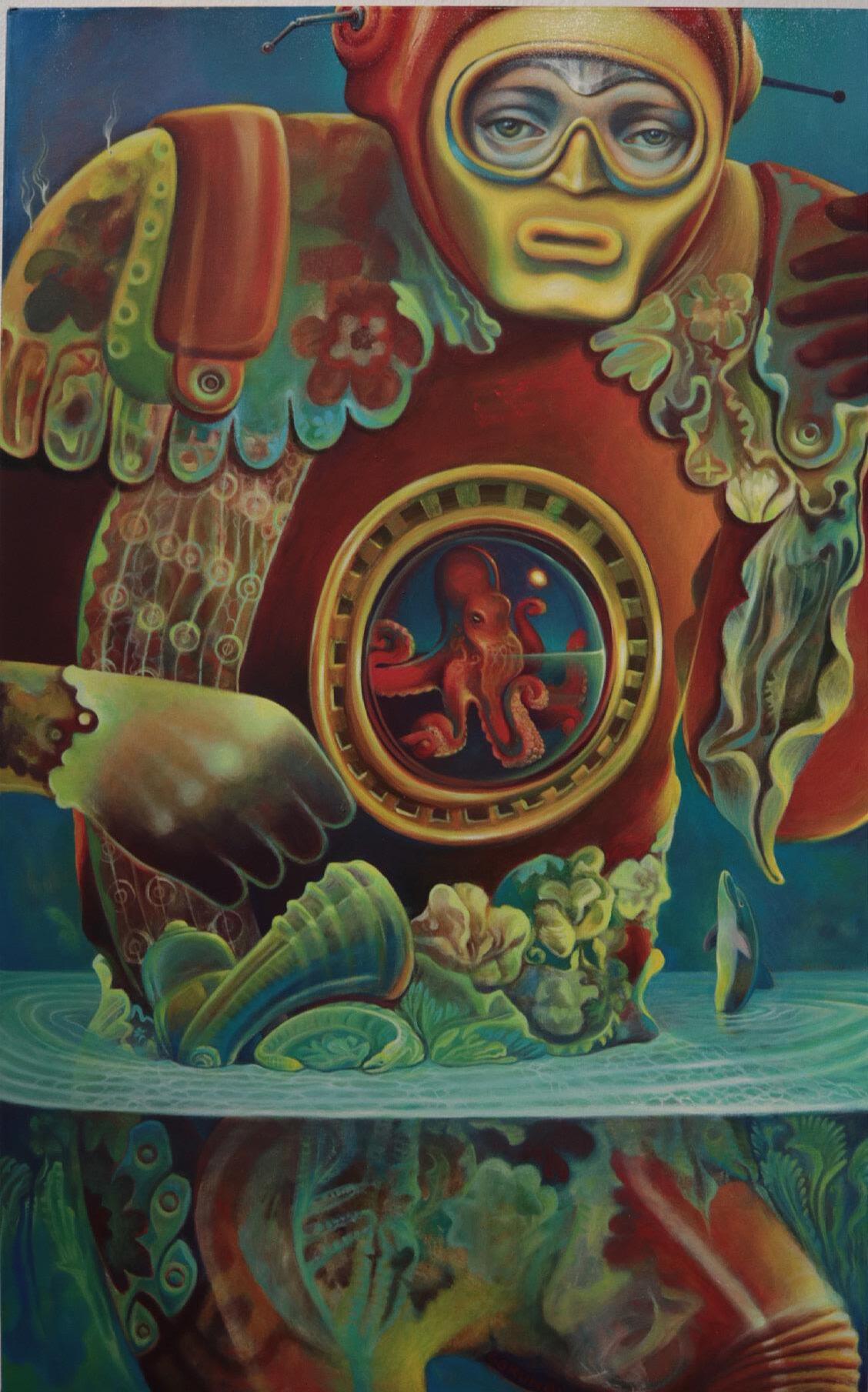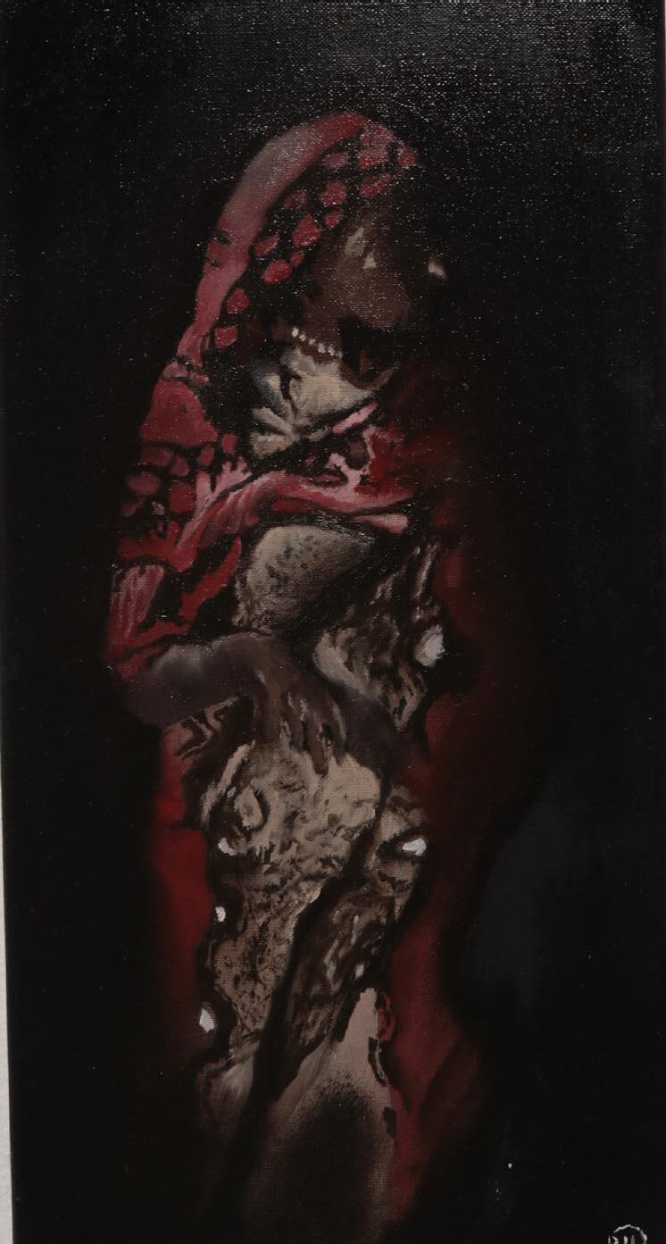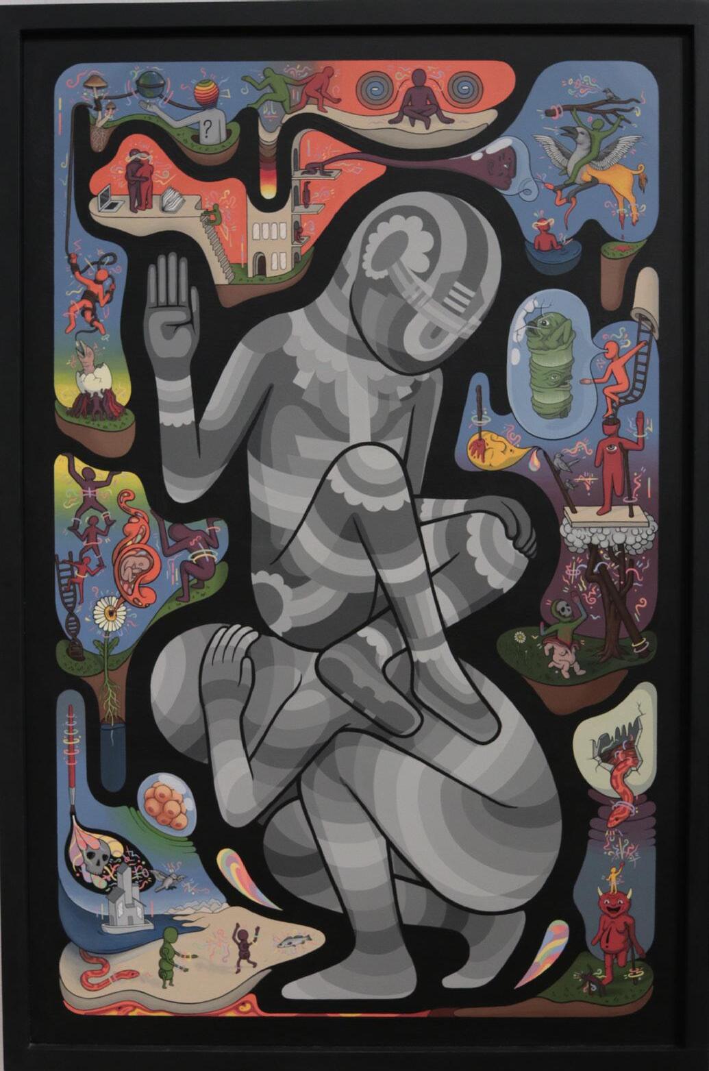 My submission to this years exhibition is a painting that I made over the last two years (‘21-‘22). I created this piece during a period of great change and betterment in my personal and professional life which resulted in something I find directly representational of this period. The central two figures are the embodiment of duality. Surrounding these figures are many different characters, settings, and symbols which are meant to speak on my own personal philosophies, desires, crutches, sacrifices and oppositions.
