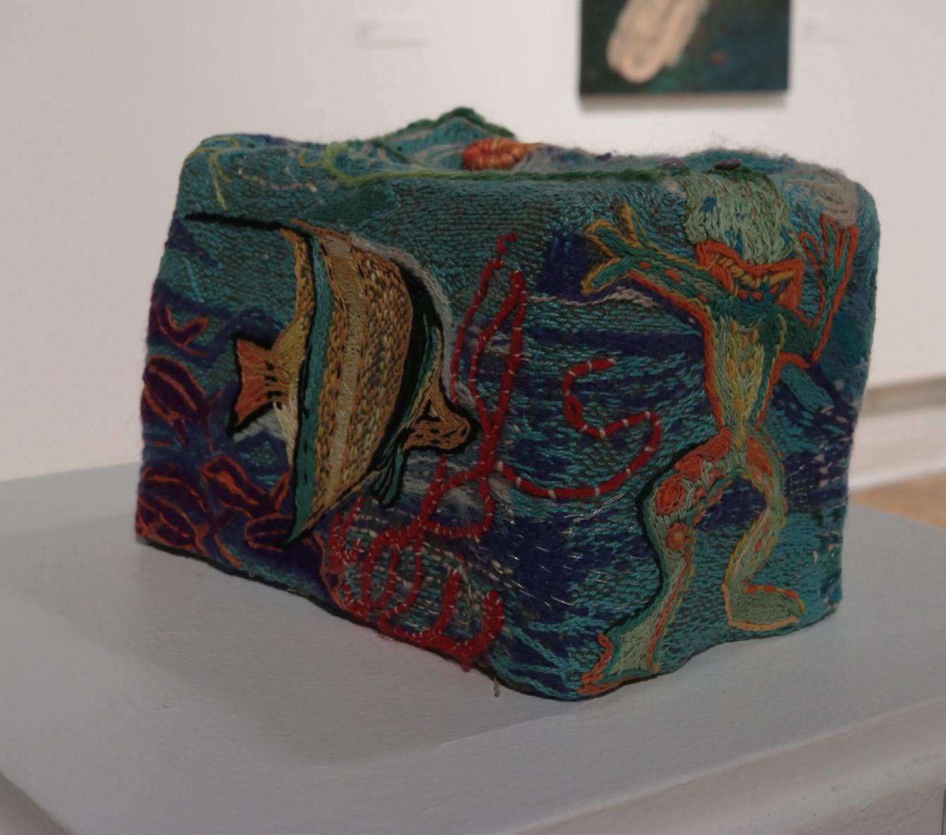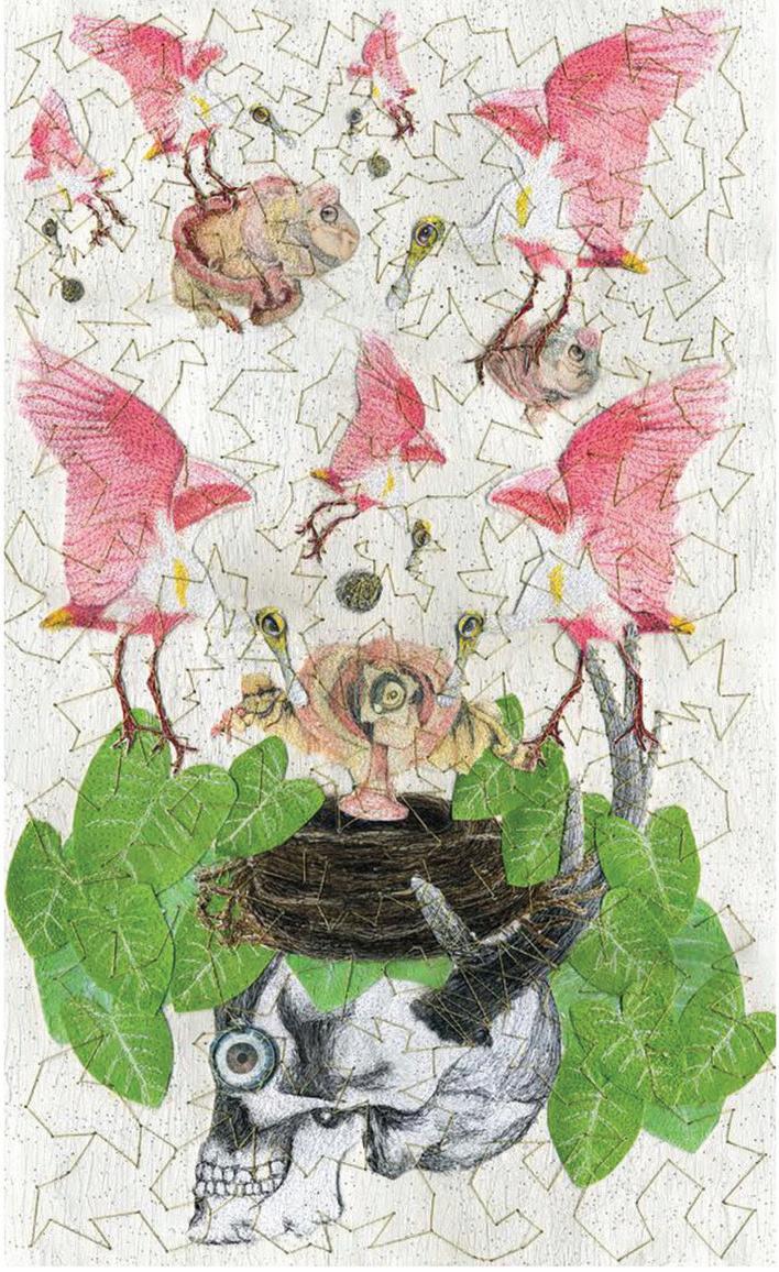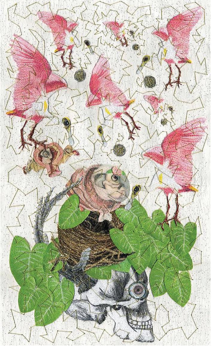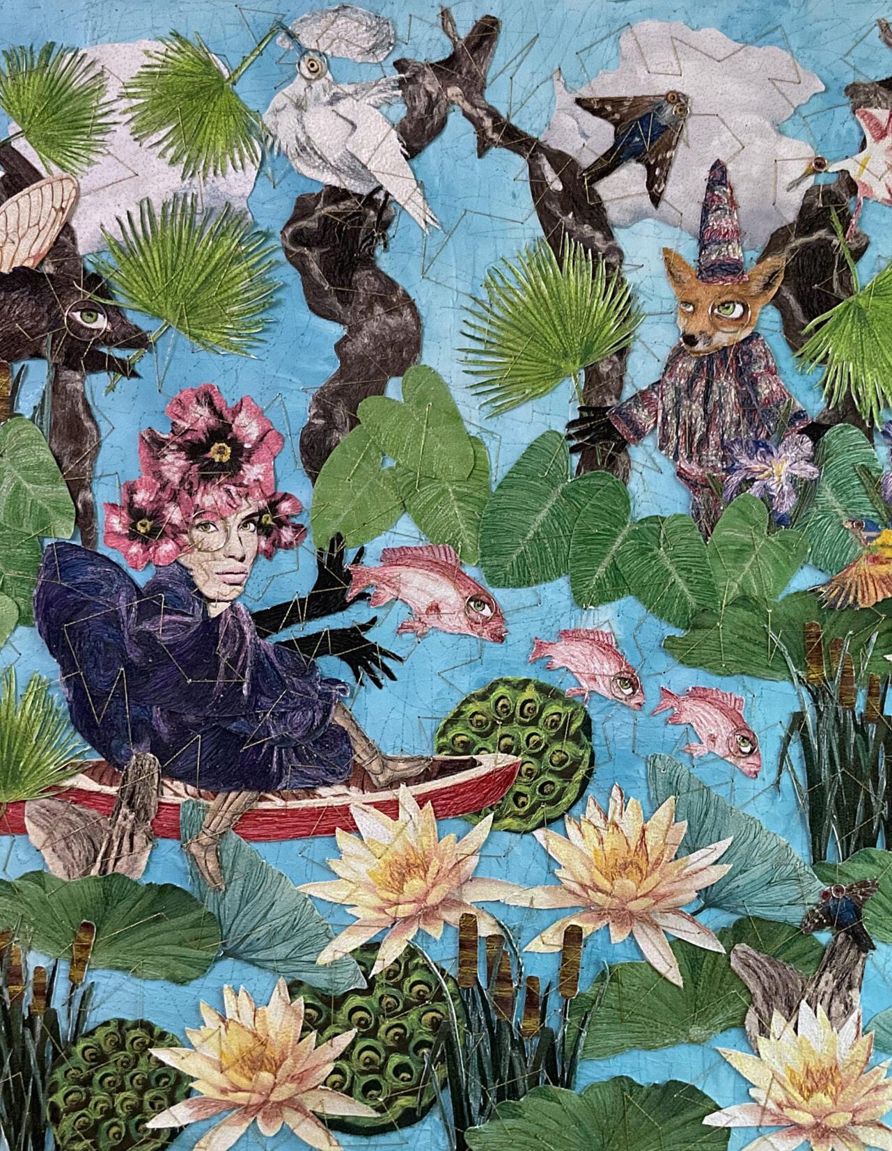 The 2023 Members Show was judged by 2022 Best in Show winner Nonney Oddlokken. Oddlokken is a contemporary artist who utilizes fiber and collage techniques to create engaging mixed-media artworks. Her solo exhibition at the PMA, on view during the same time as the Members Show, was titled Tiny, Little Fables. The references in this body of work mix elements from her own childhood “fables,” Catholic references, Cajun folklore, New Orleans Voodoo, and the indigenous flora and fauna of Louisiana swamps and bayous. Her work employs a unique process that consists of handmade paper substrates and collage elements that are finished with hundreds of yards of hand-stitched gold thread embellishments.
