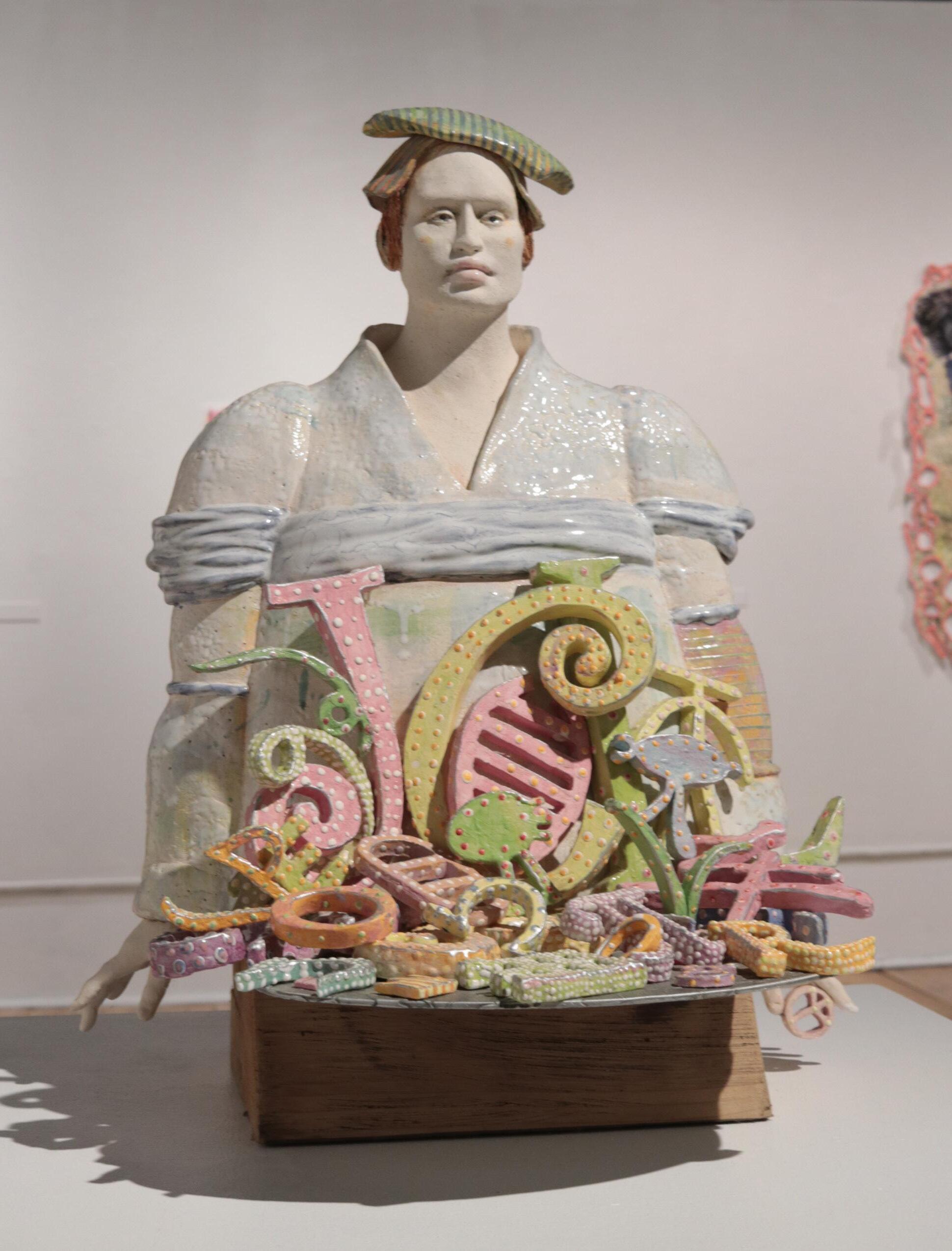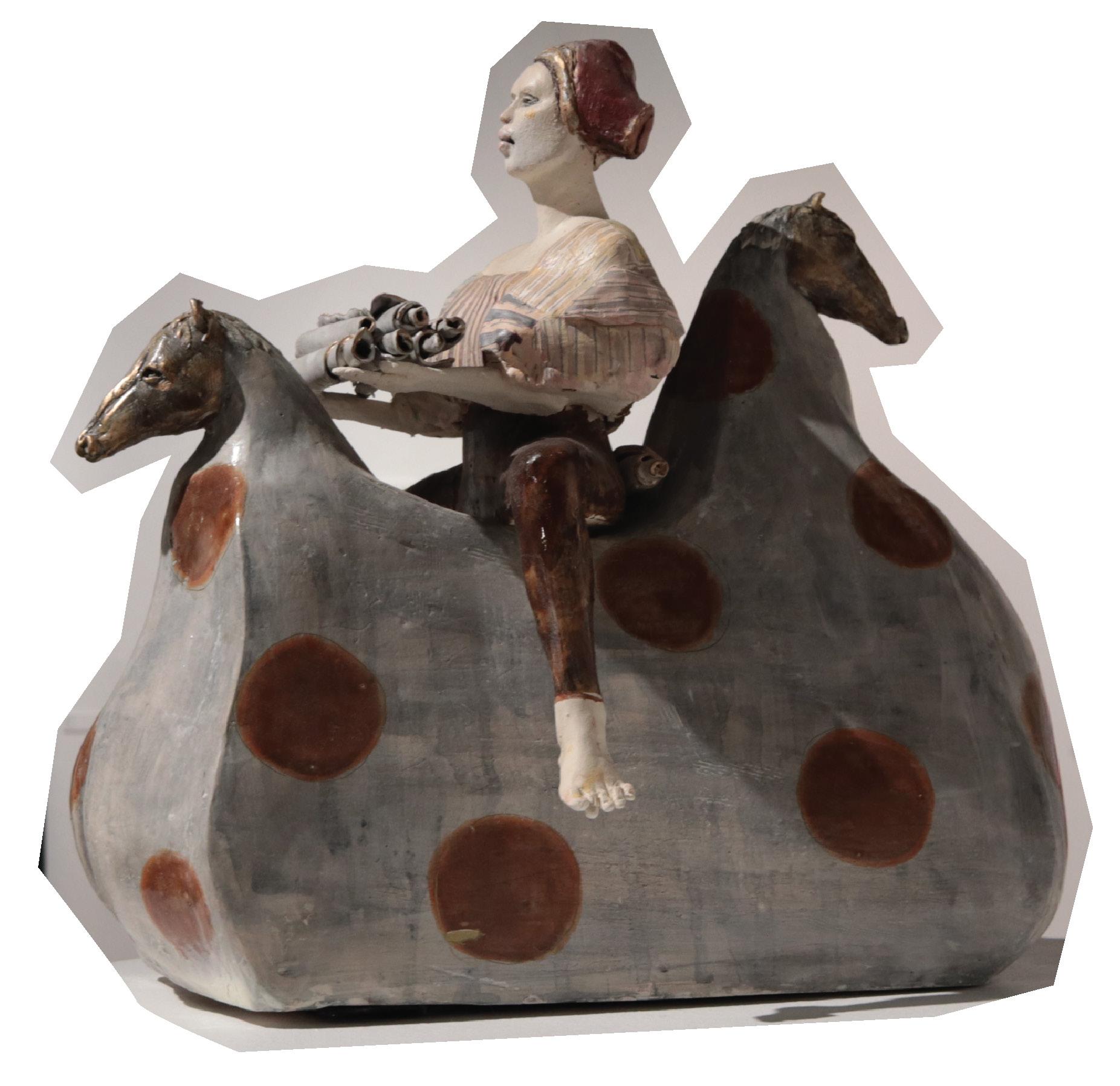 My figures offering alphabets, symbols, and scrolls were sculpted in response to witnessing a kind gesture during a divisive time. I watched a political candidate visit a talk show that espoused views antithetical to his own. Although the show hosts either interrupted or ridiculed him, he remained poised and kept returning. Soon, the hosts not only let him finish talking, they thanked him for stopping by. When asked why he’d kept returning after being treated so poorly, the man answered that he’d hoped to offer nice people ideas they might not otherwise be exposed to and vice versa. I thought his reason was kind: more important than the content of the offer was the gesture of offering itself. In response, I began sculpting this series of figures offering letters and symbols from alphabets, past and present, of different countries and tribes: cuneiforms, hieroglyphs, Arabic and Chinese characters, Babel-like inscrutable gold-trimmed scrolls. They come by horse and longboat into a wilderness, emboldened by a belief that ideas, manifested by colorful polka-dotted alphabets, symbols, and scrolls, can be shared.