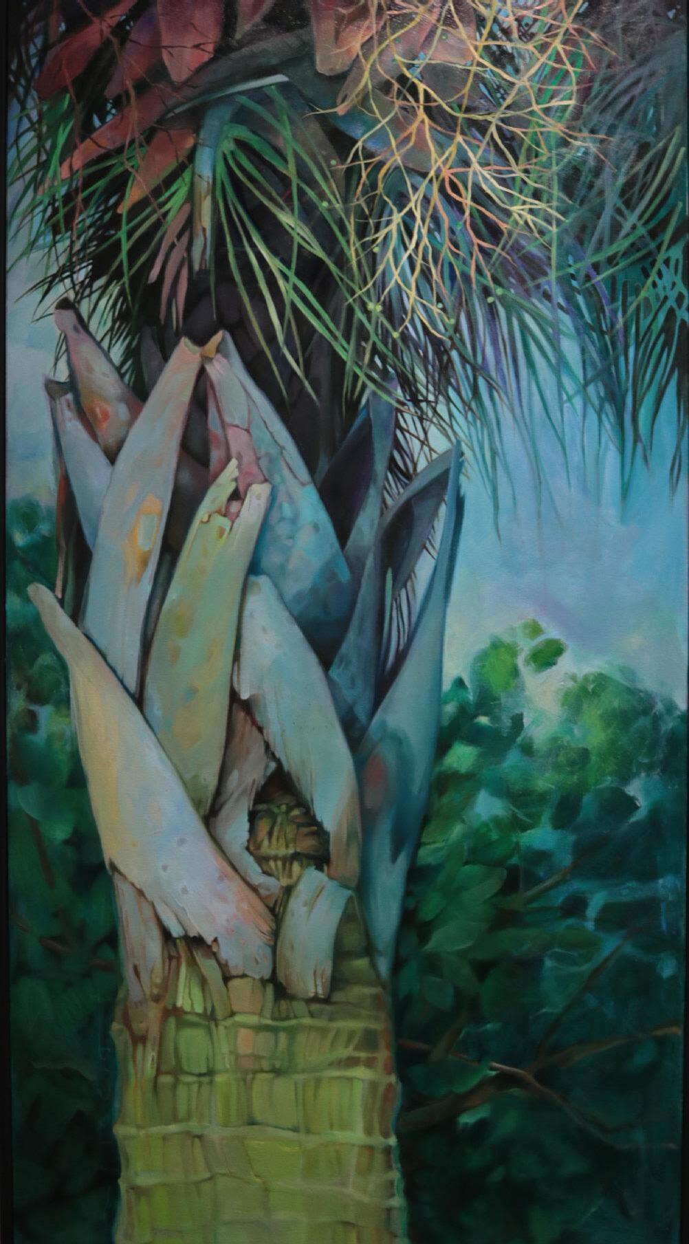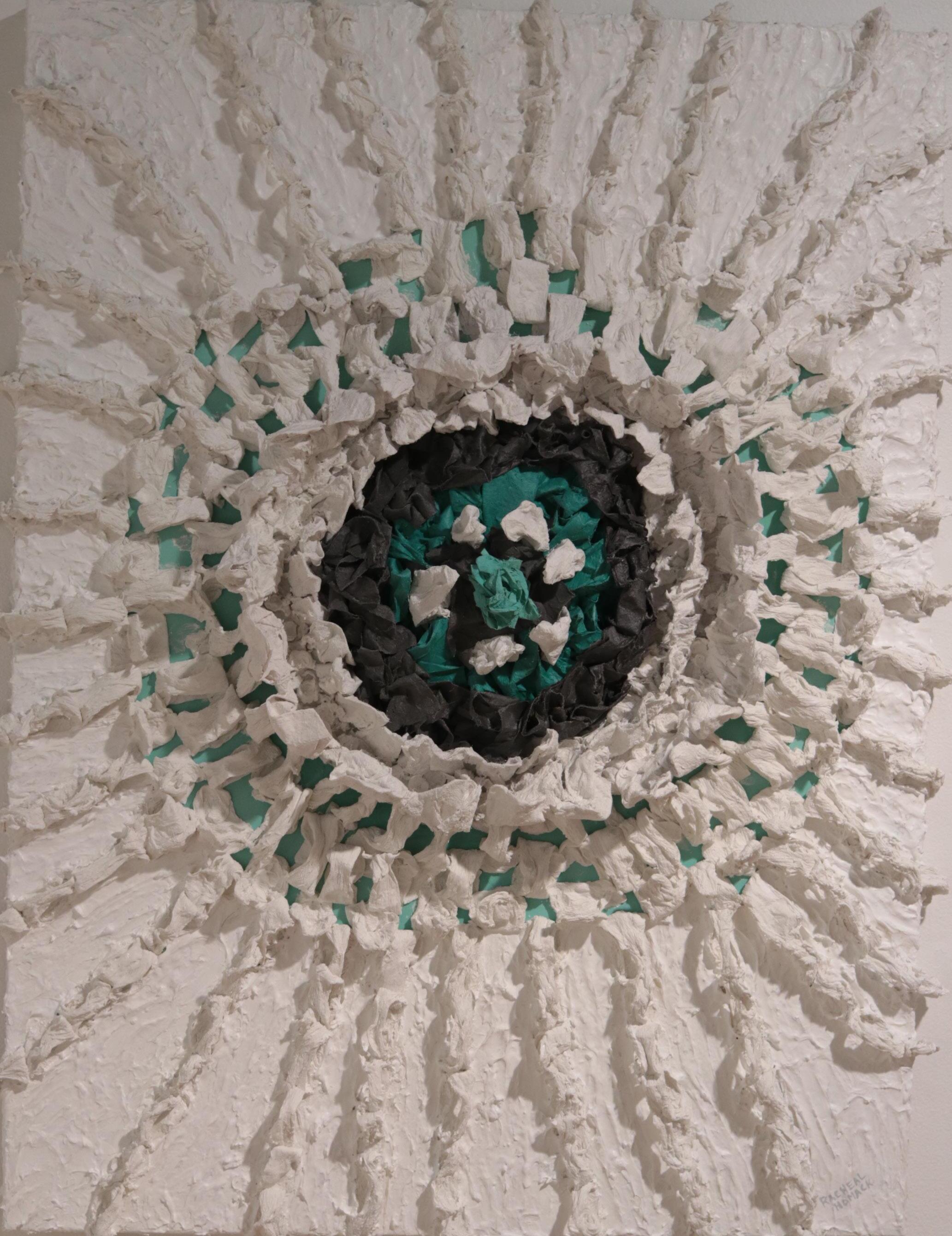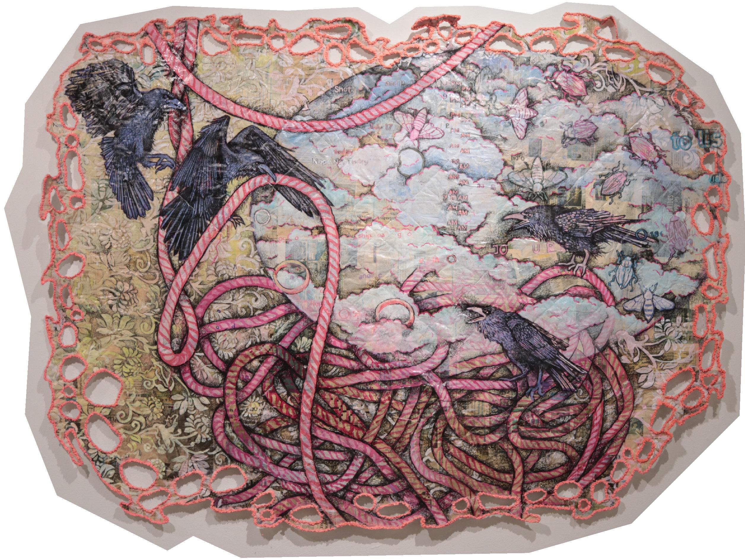NEST is a work from my series “Survival Paradoxically Involves Surrender”. Nothing in nature exists in isolation; everything is part of a larger complex, universal system. Author/Biologist David George Haskell writes, “Survival paradoxically involves surrender, giving up the self in union with its allies. We’re all- trees, humans, insects, birds, bacteria- pluralities. Life is an embodied network…where ecological and evolutionary tensions between cooperation and conflict are negotiated and resolved. These struggles often result not in the evolution of stronger, more disconnected selves, but in the dissolution of the self.” I’ve long utilized rope/string as a metaphor for that interconnection, for all the push, pull, connection and slack it encompasses. More than ever, we work to separate ourselves from our ties that bind, and each move away from our centeredness pulls everything an inch closer to oblivion. A nest, however- a close network of interconnectedness- this is home, rest, restoration and regeneration. Works on collaged, papered quilt stemmed from my desire to work large without all of the transportation and storage difficulties, and immediately I was hooked on the physicality of the textured surface. The edges of the work, disintegrating into orange fluorescence, are a nod to the disappearing Gulf coastline. A viewer mentioned a likeness to the bright pink-orange egg clusters of the invasive apple snails we find in our waterways. I loved that comparison.