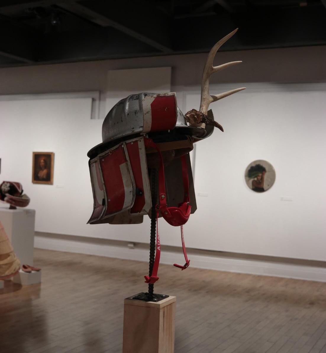 steel, plywood, turf, chinstrap, oil rigger helmet, stop sign, antler