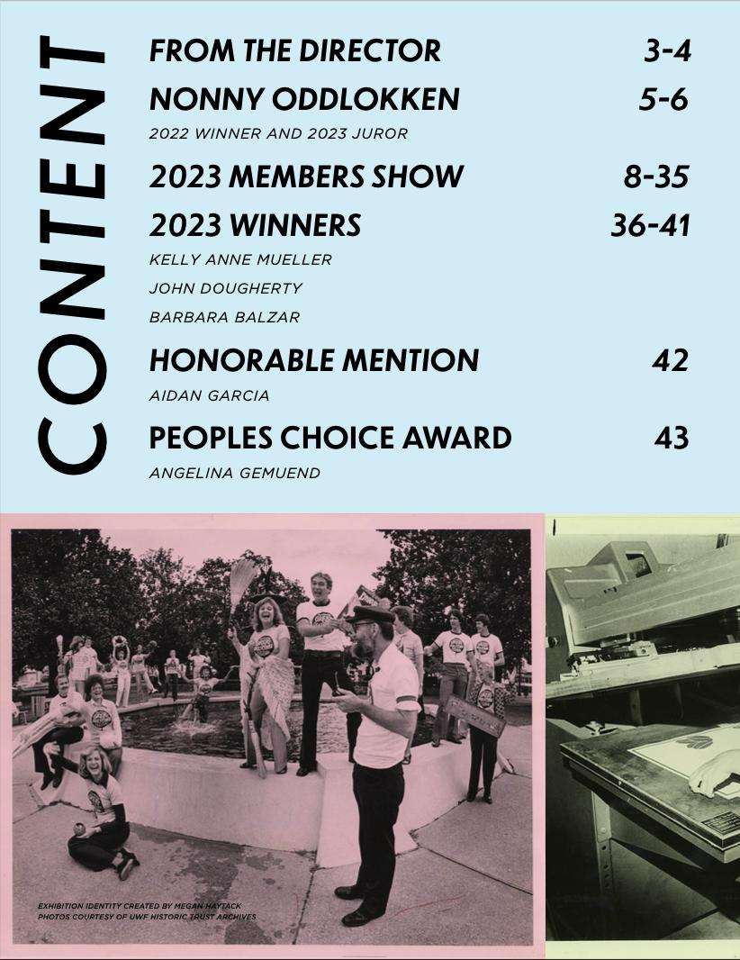 This years Members Show Identity was created by UWF students Megan Haytack and Karla McMillan who are a part of the student-led design group called TAG Team. With the help of their mentors John Dougherty and Richard Rodriguez, the students created, designed, and installed all collateral invloved with the 2023 Members Show, including this catalog. Images featured on this spread are courtesy of UWF Historic Trust Archives.
