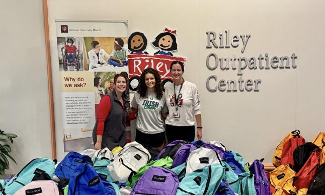 Sophia Trobridge, pictured center, and Dr. Tara Holloran, pictured on the right, standing in front of the 400 backpacks they had packed at the Riley Outpatient Center. The Center allowed Sophia the opportunity to focus her Andre Project on helping the victims of abuse reenter the world after being discharged. Trobridge said, “Don’t be afraid to reach out to local organizations or ask for help from mentors. They can help turn an idea into something much bigger.”