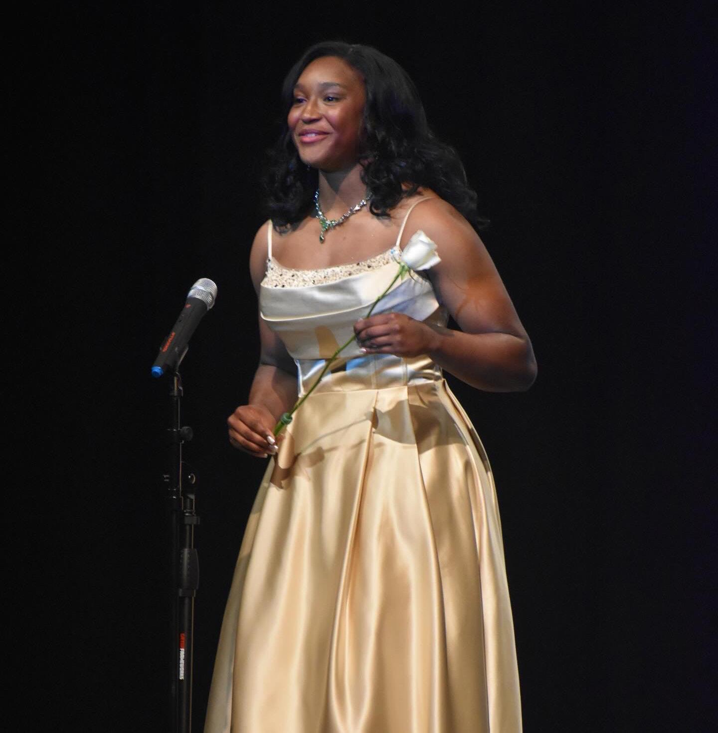 Senior Erica Davis stands in front of the microphone at the Miss Circle City Coronation. Davis stood on the stage and gave her formal presentation, her introductions, her future plans, and her aspirations for the future.