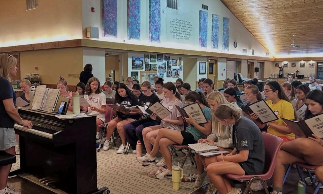 Director Marian Bender leads Irish Adrenaline through vocal rehearsal during their summer camp, guiding the group as they learn new music and polish harmonies. The early days of practice are filled with focus, determination, and encouragement from both directors and students. By the end of the week, the choir begins their set as a united voice.