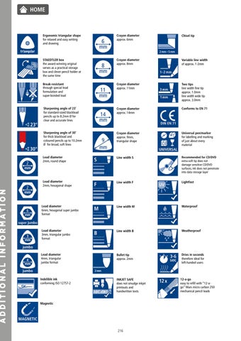 1414 Article number 100P1101121285132116 DegreesShape 6 colours 126Bdegrees–4H HB HB, 2B HB 2B, 6B Lead diameter 3.6mm 2mm 2mm 3mm 2mm 2B – 3mm 6B – 4mm Key features • Special highformulationleadwithlevelofpigmentforfinedetailsinpastel • Ideal for office, school & home use • Break resistant super bonded lead • Eraser tip • Ideal for office, school & home use • Speciallysmallfordesignedhands•Fosterscorrectgrip • qualityGoodgeneralpurposepencil•Erasertippencil • Speciallysmallfordesignedhands•Fosterscorrectgrip Packaging Blistercards Boxes, blistercardscups,&dispenser Boxes & blistercards Boxes, cups, & blistercards Boxes & blistercards Boxes, cups, & blistercards Page 19 20 21 21 22 22 overview of pencils PENCILS HOME