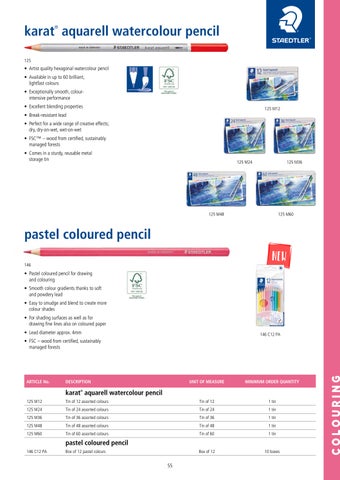 TRIPLUS® highlighters 128-130 highlighter refills 129 gel highlighters 131 dry highlighters 131 graphite pencils 74-75 colouring pencils 76-79 watercolour pencil 77-79 colouring accessories 80-81 double-ended pens...........................................82-83 mixed sets 84-87 paint 88 watercolour crayon 88 pastels 89 metallic markers 90 calligraphy pens 91