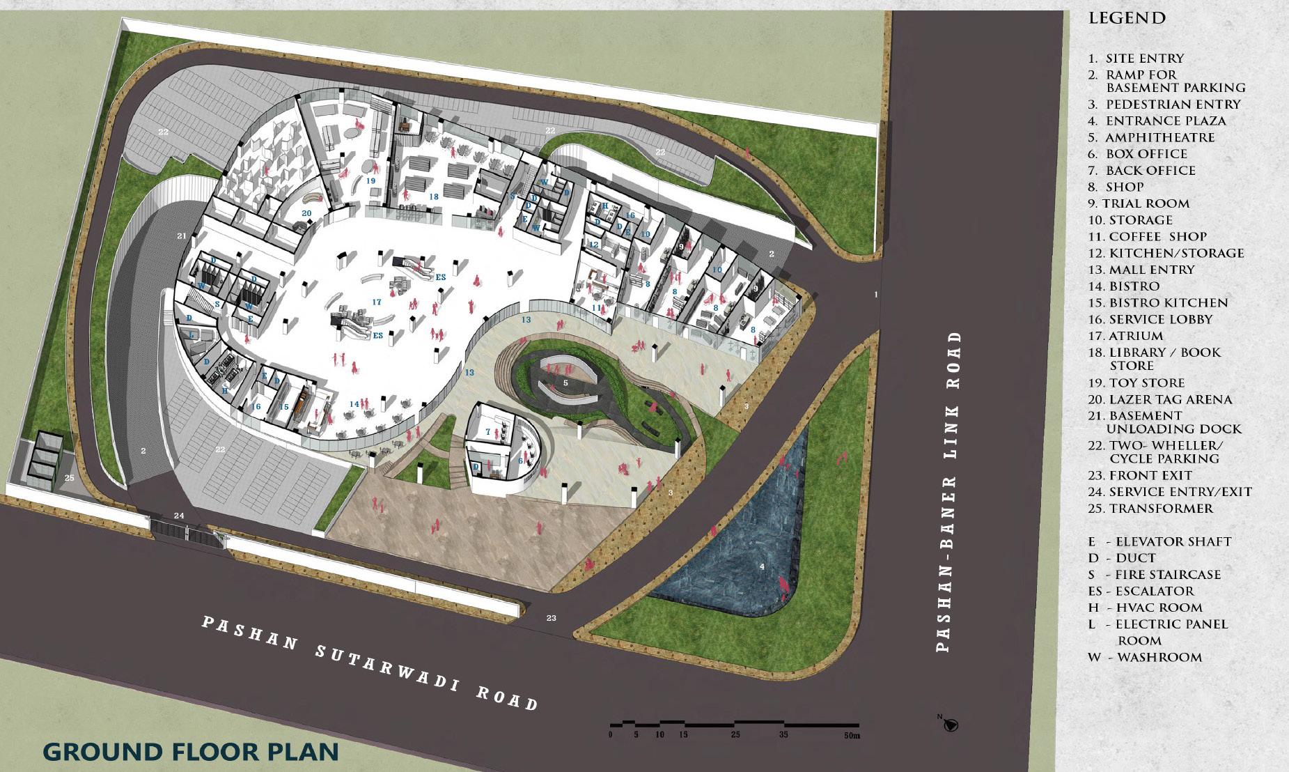 Urban entertainment plaza for the rapidly developing Baner, a suburb of Pune,India. The program included 4 cinema screens, 2 foodcourts, a bowling alley, a cafe, art gallery, gym, sauna, squash courts, a bookstore, a gaming arcade and multiple shops