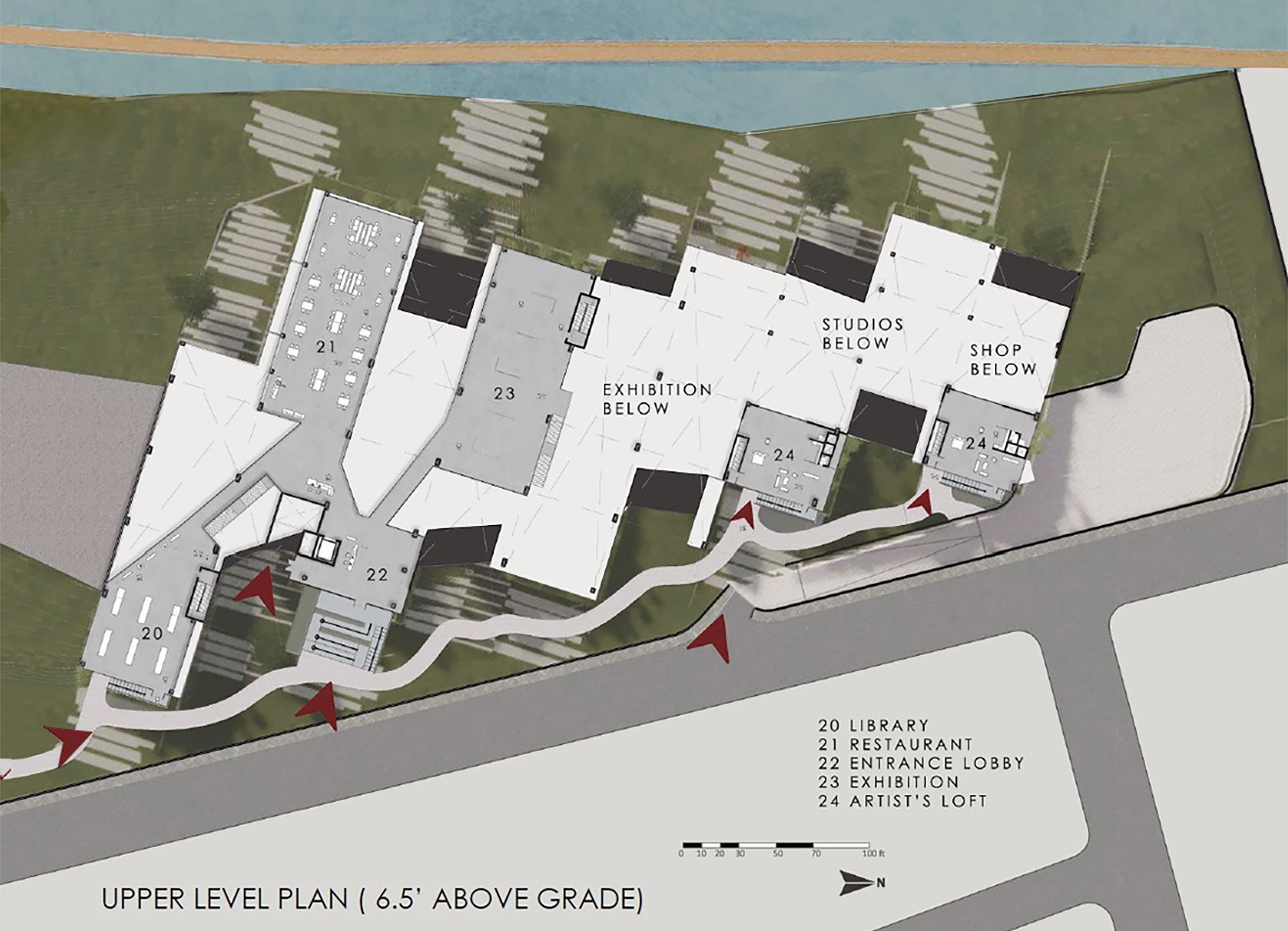 The floating bridge form also creates the illusion of a doorway welcoming people to the site.
