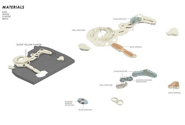 diagrams materiality, program, and volume diagrams breaking down the makeup of the project