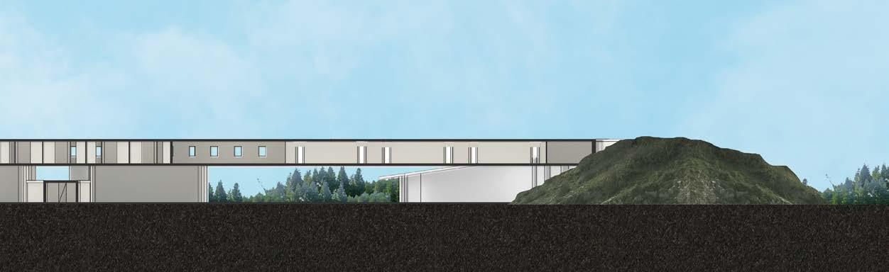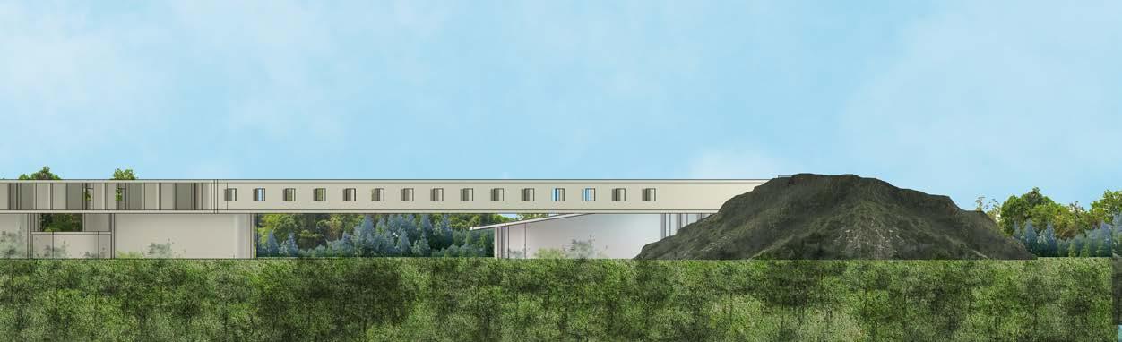 section cut through the hill, private suites, and circulation spaces