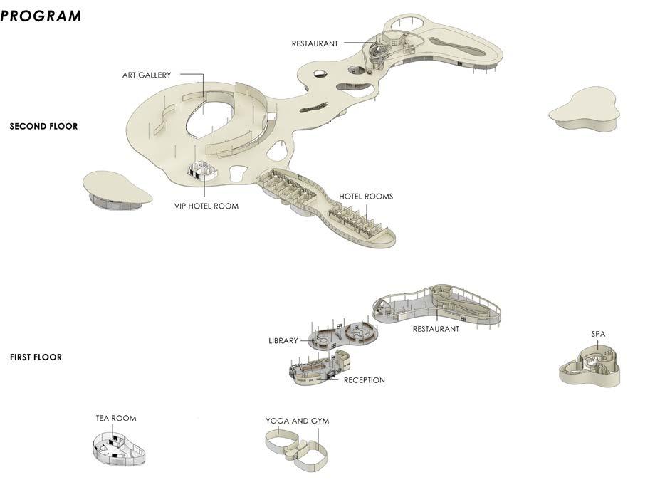 Located near Dalian Lake, this project is a luxuary hotel complex in the midst of nature. The natural landscape surrounding it provides an escape from city life. There are several unique programs scattered on the site for users to stumble upon as they navigate the site. The concept of “dew on lotus” comes from the presence of water gardens filled with water lilies and lotus plants that surround this site. As dew gathers on lotus leaves in the early hours of the mornings, it comes together to create organic forms, and those forms are brought into the forms of the hotel. Through the several experimenations of these organic forms of dew drops coming together and growing apart, the volumes and planes of this project take inspiration from the negative and postive spaces of a lotus leaf filled with dew drops.