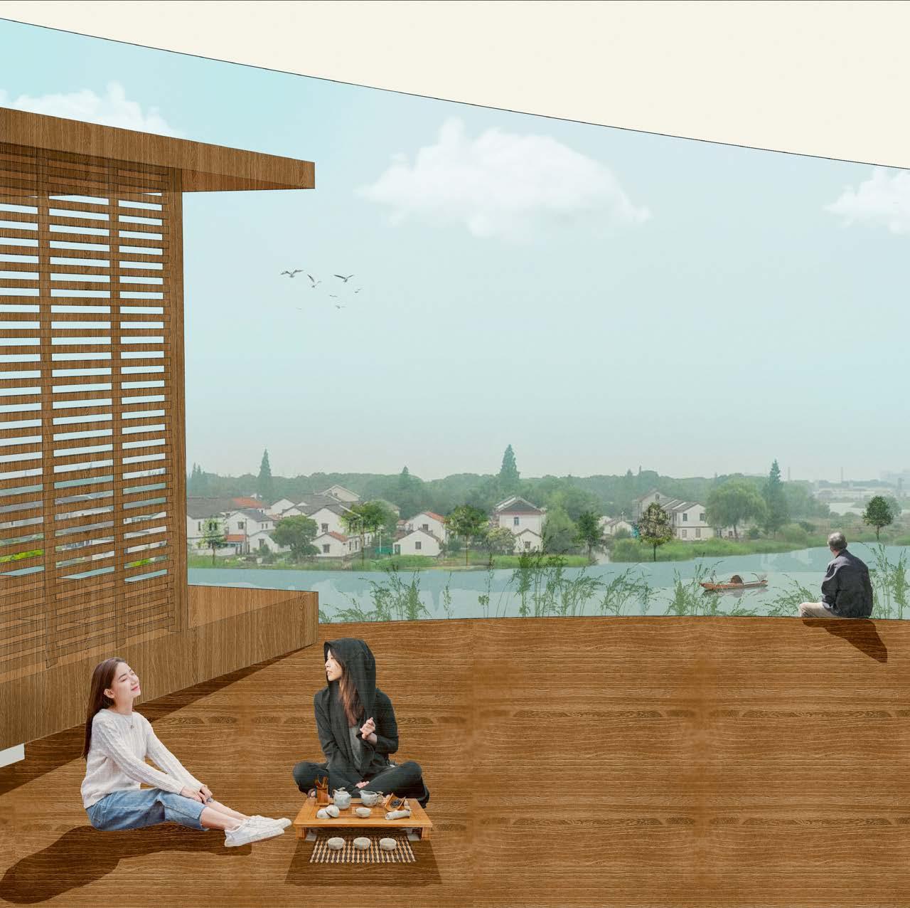 tea room render render of the team room looking over the water boardering the site and the viallges surrounding it