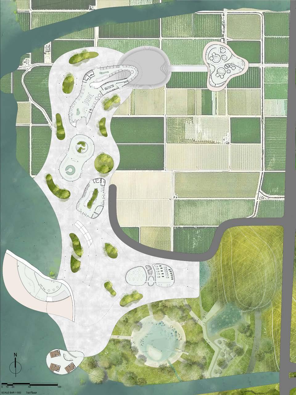initial model of a part of the site that includes solar panel fields, a walkway, bodies of water that cover the portions of the land. this part of the design was more organic