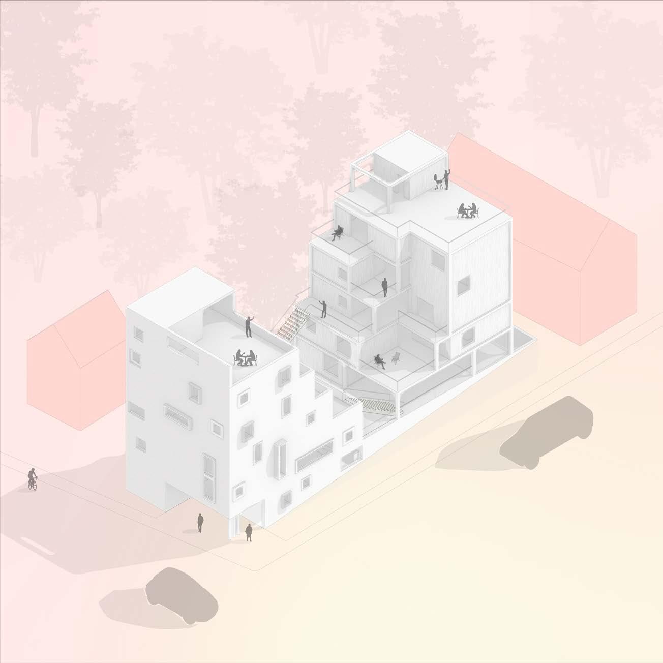 axon view of the temporary living space, showing both facades that face the street