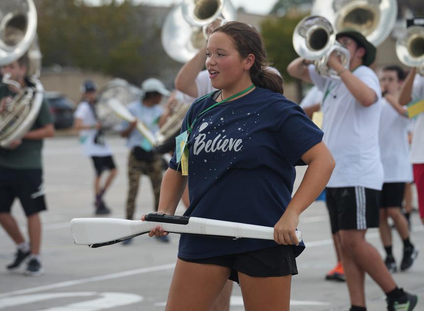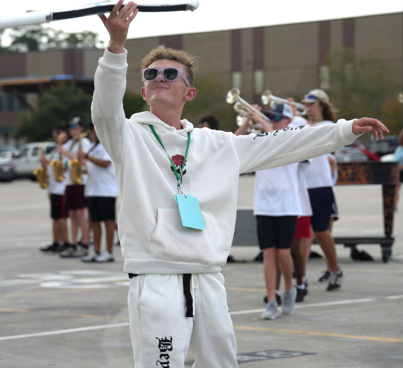 Sophomore Ean Osbourn practices with the band on the school parking lot. He spent much of his summer with the Iowa Colts, where he traveled and performed with the group’s color guard. Photo by Maya Ortiz.