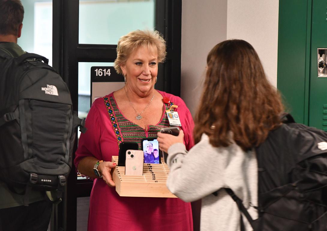 Algebra teacher Martha Purcell collects phones in a caddy before class. The new policy was implemented at the start of the school year. Photo by Arleigh Doehring.LATEST PHOTOS